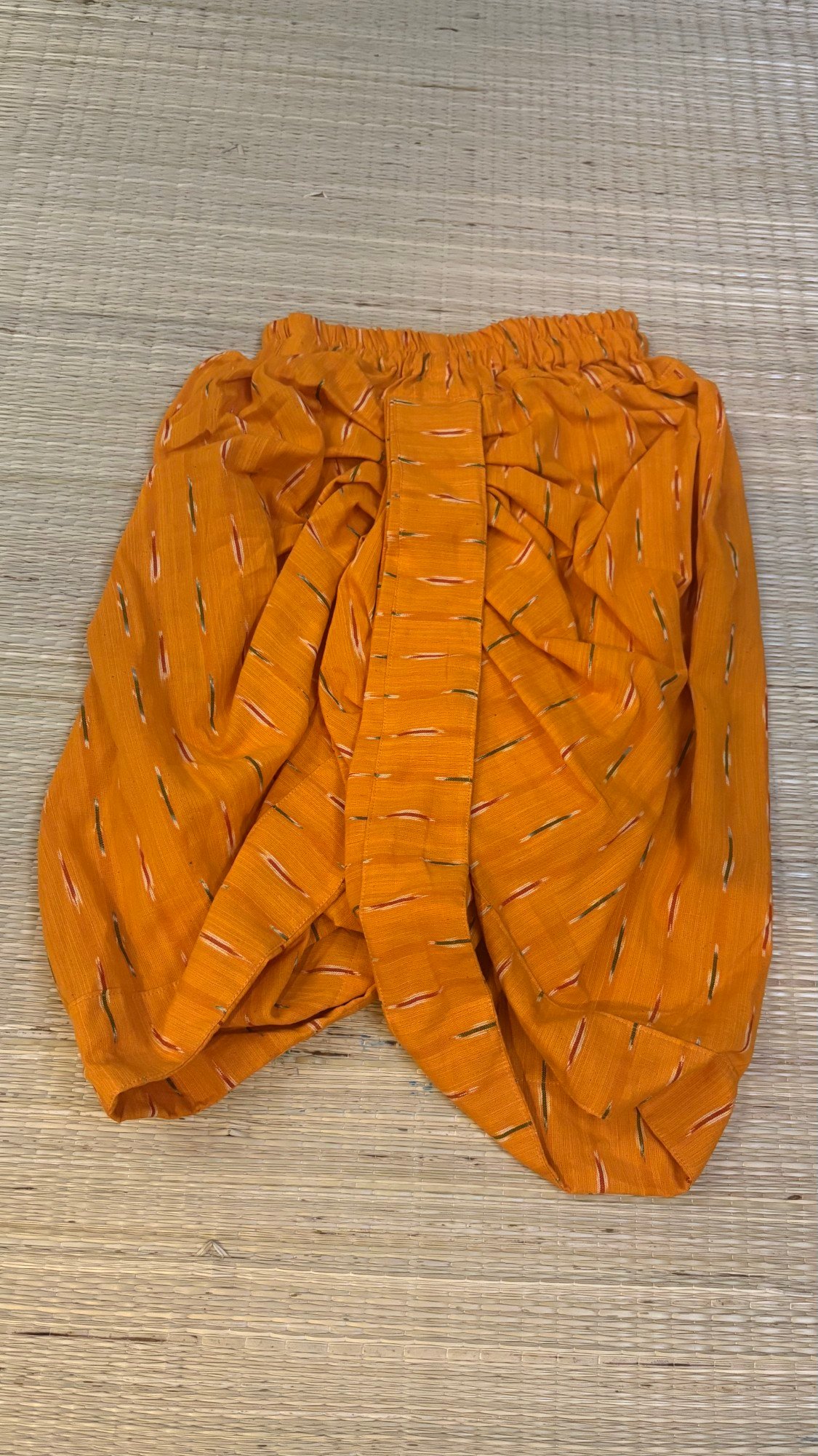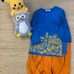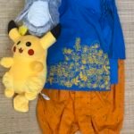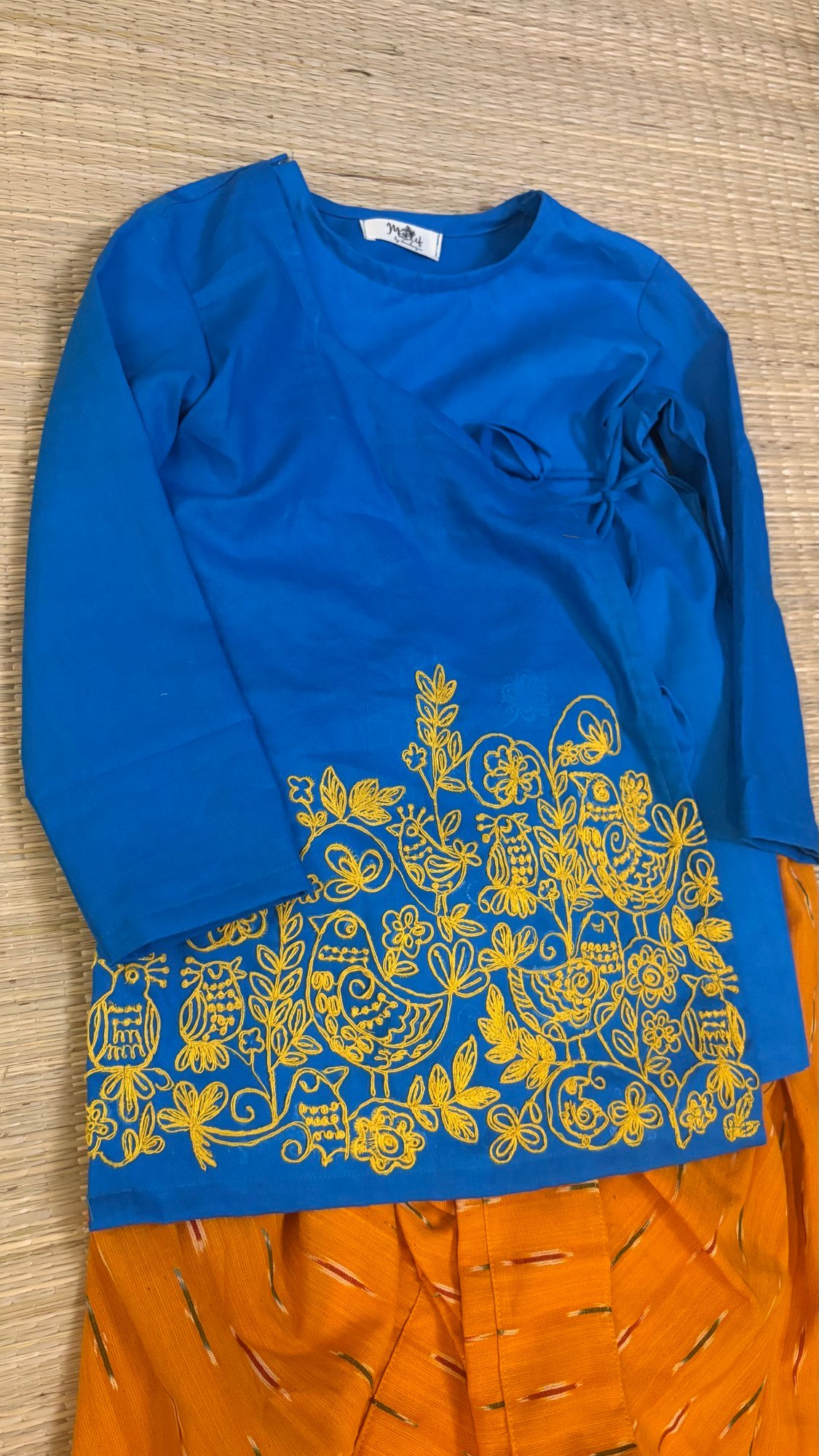 Arik Babur Set is a thoughtfully handcrafted kids Punjabi and ikkat dhoti ensemble that celebrates traditional artistry with playful elegance. The rich blue Punjabi is adorned with intricate yellow dori embroidery featuring birds, vines, and floral motifs, adding a lively yet graceful charm. Finished with a delicate side tassel detail, the kurta pairs beautifully with a comfortable ikkat dhoti, making it perfect for festive occasions, cultural gatherings, and special celebrations.