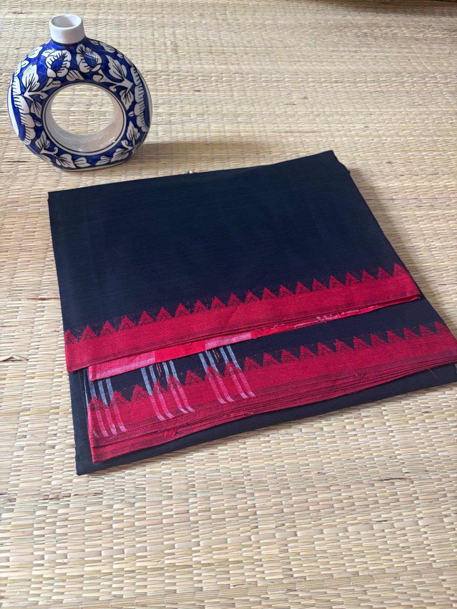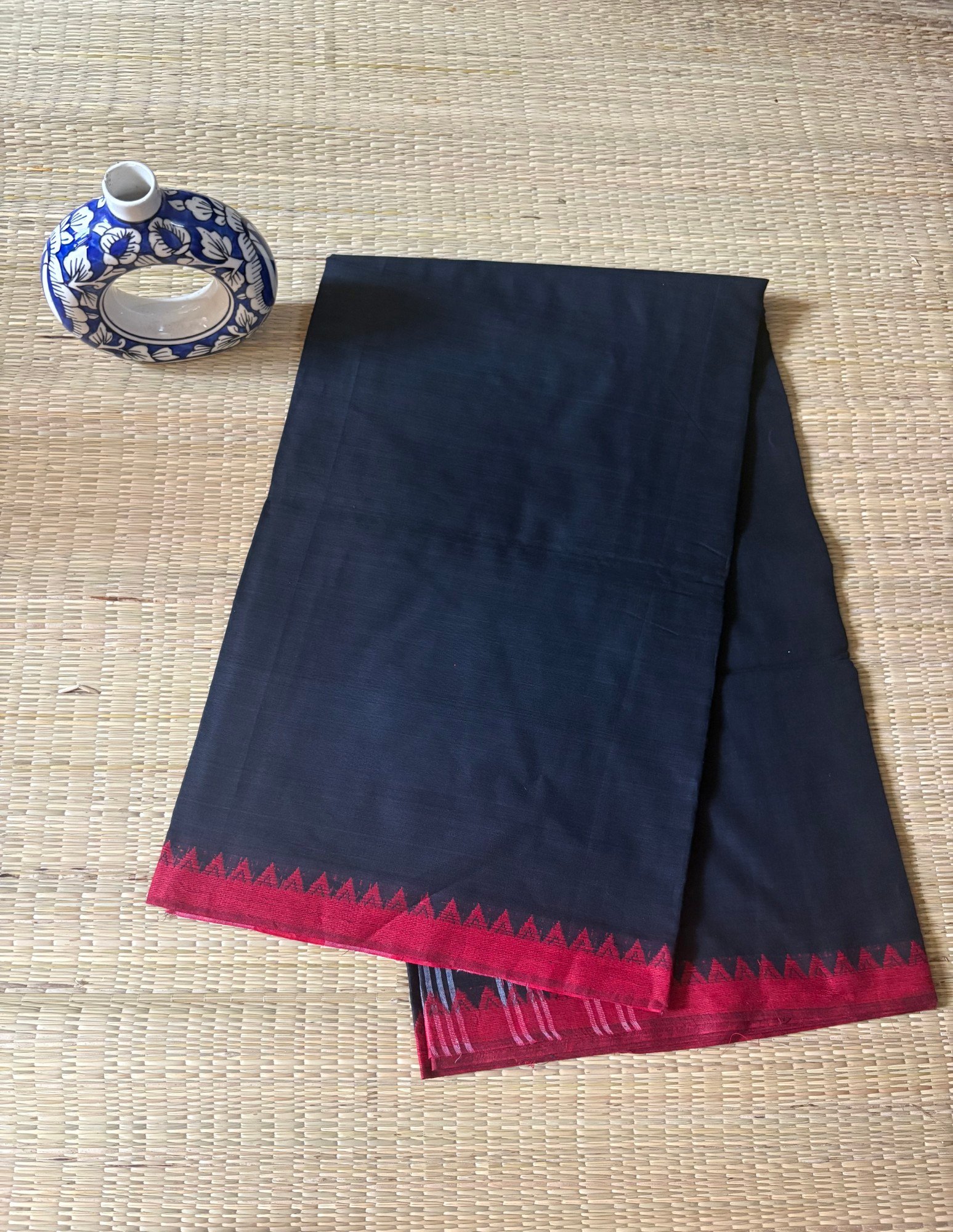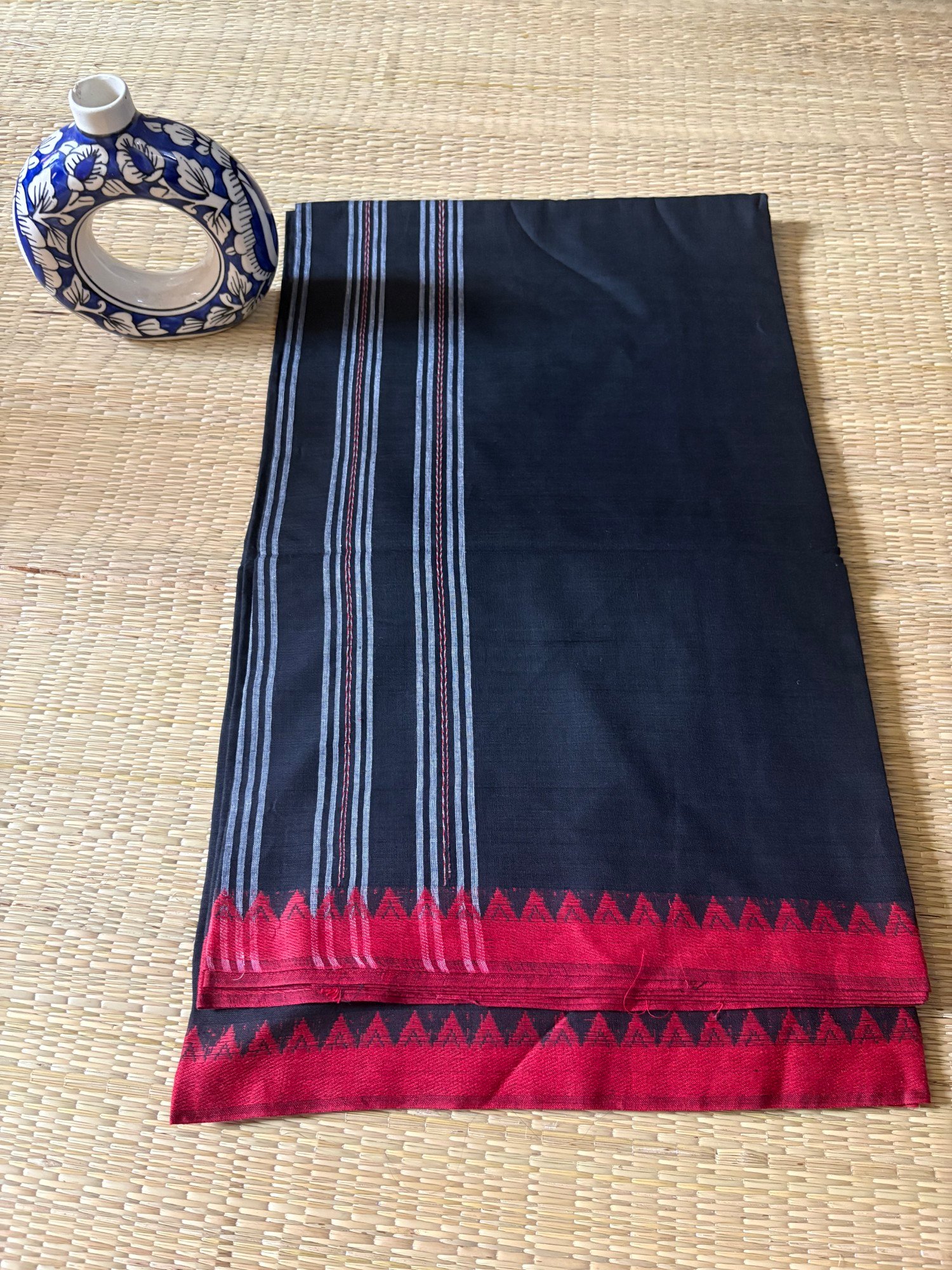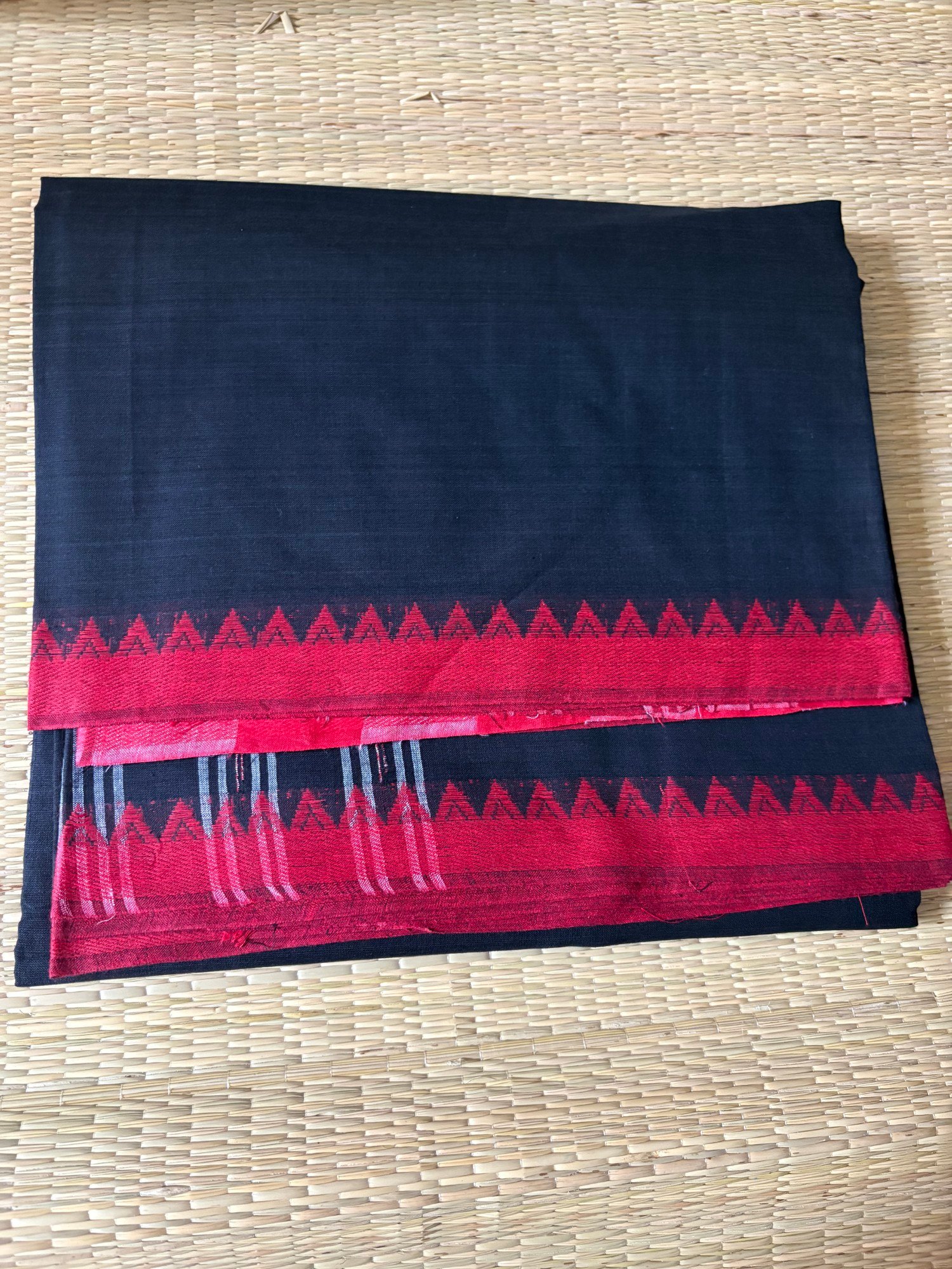 This handwoven Dhoniyakhali saree in deep classic black is a timeless expression of simplicity and grace. Accented with a subtle red border, it reflects the beauty of traditional Bengal handloom craftsmanship. Lightweight, breathable, and effortlessly elegant, this saree is perfect for everyday wear as well as minimal festive styling.