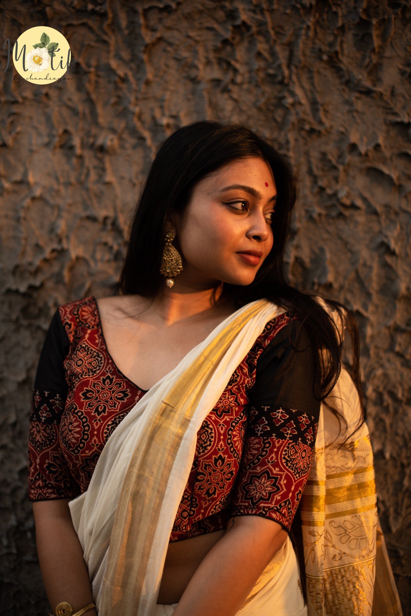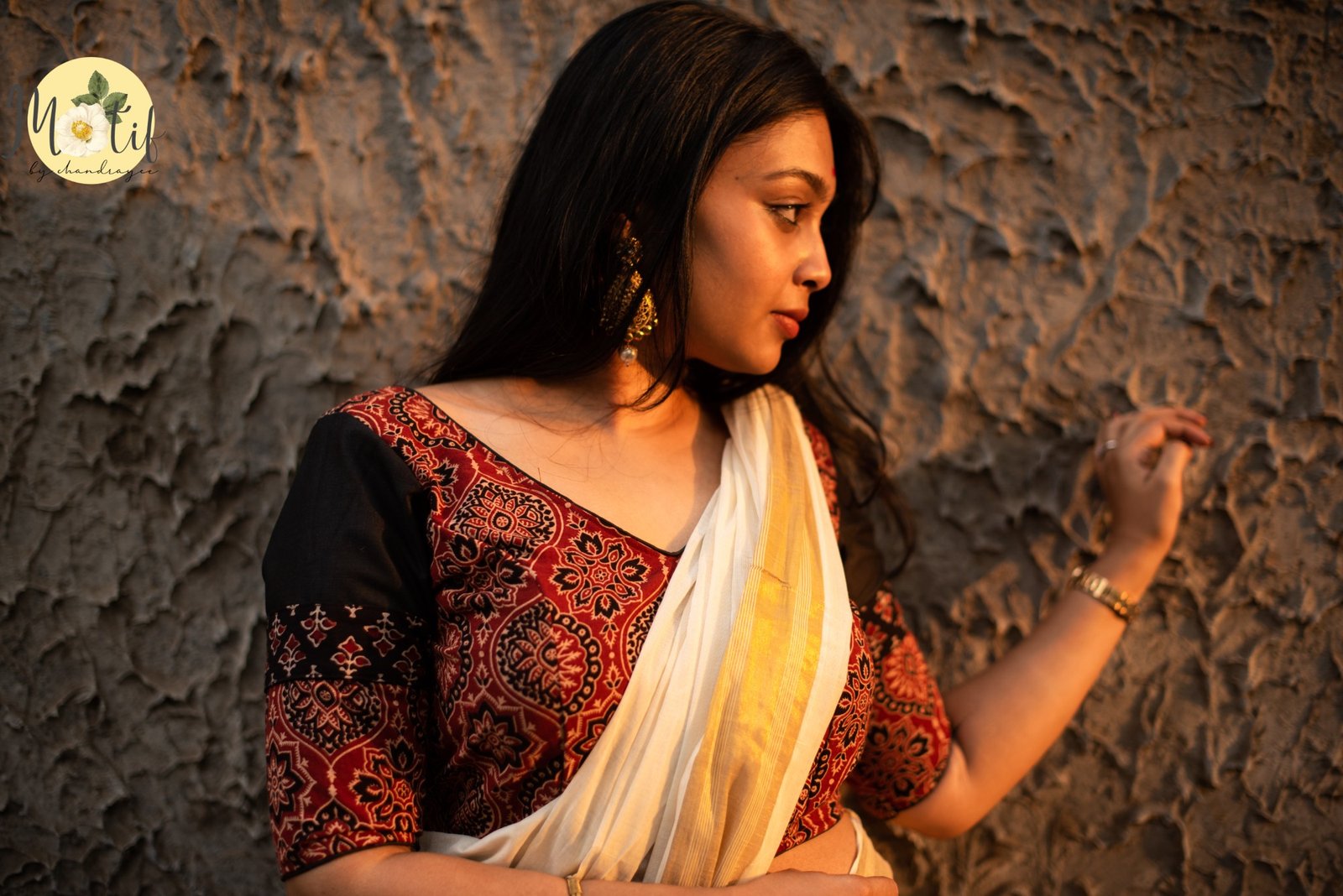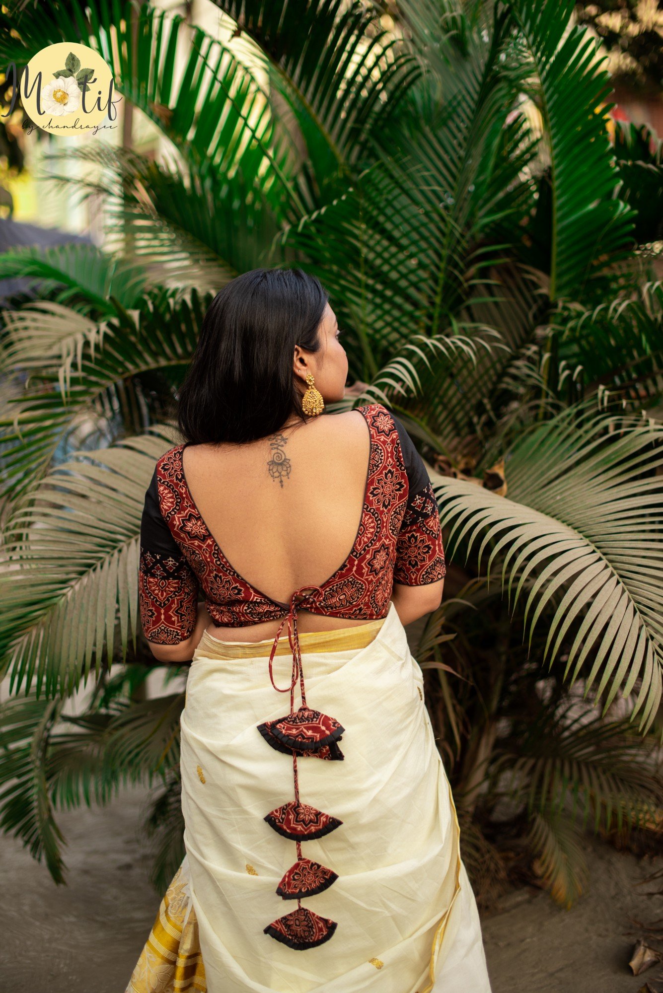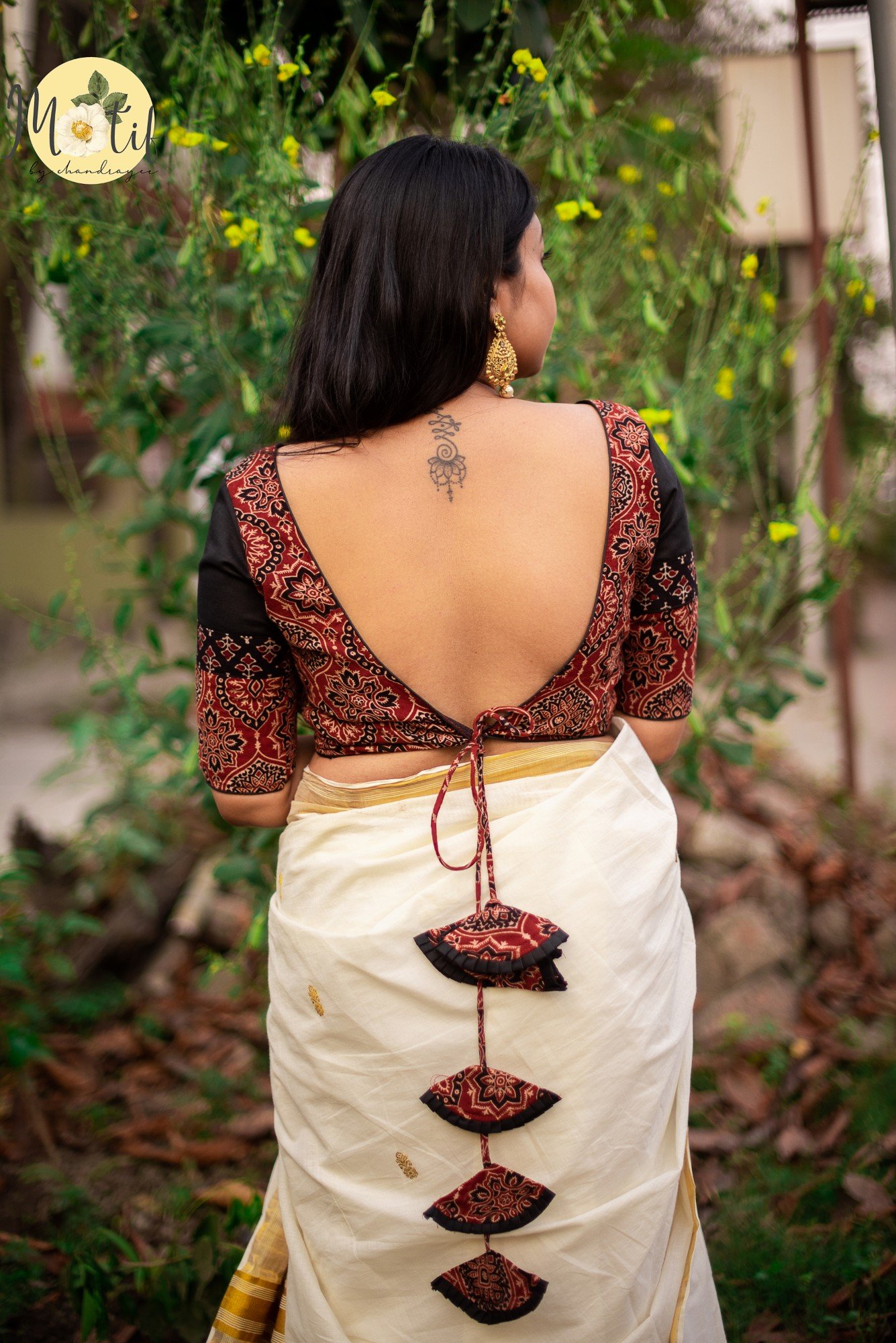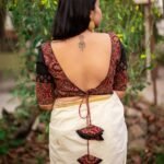 The Boho Rust Ajrakh Cotton Blouse celebrates handcrafted elegance with its rich rust-colored Ajrakh base. Designed with a V-shaped padded front neckline, the blouse offers a structured yet graceful fit. The deep V back neck is enhanced with handcrafted Ajrakh tassels, finished with delicate black frill detailing that adds contrast, texture, and a subtle boho accent. Comes padded. A perfect statement blouse to pair with handloom and contemporary sarees alike.