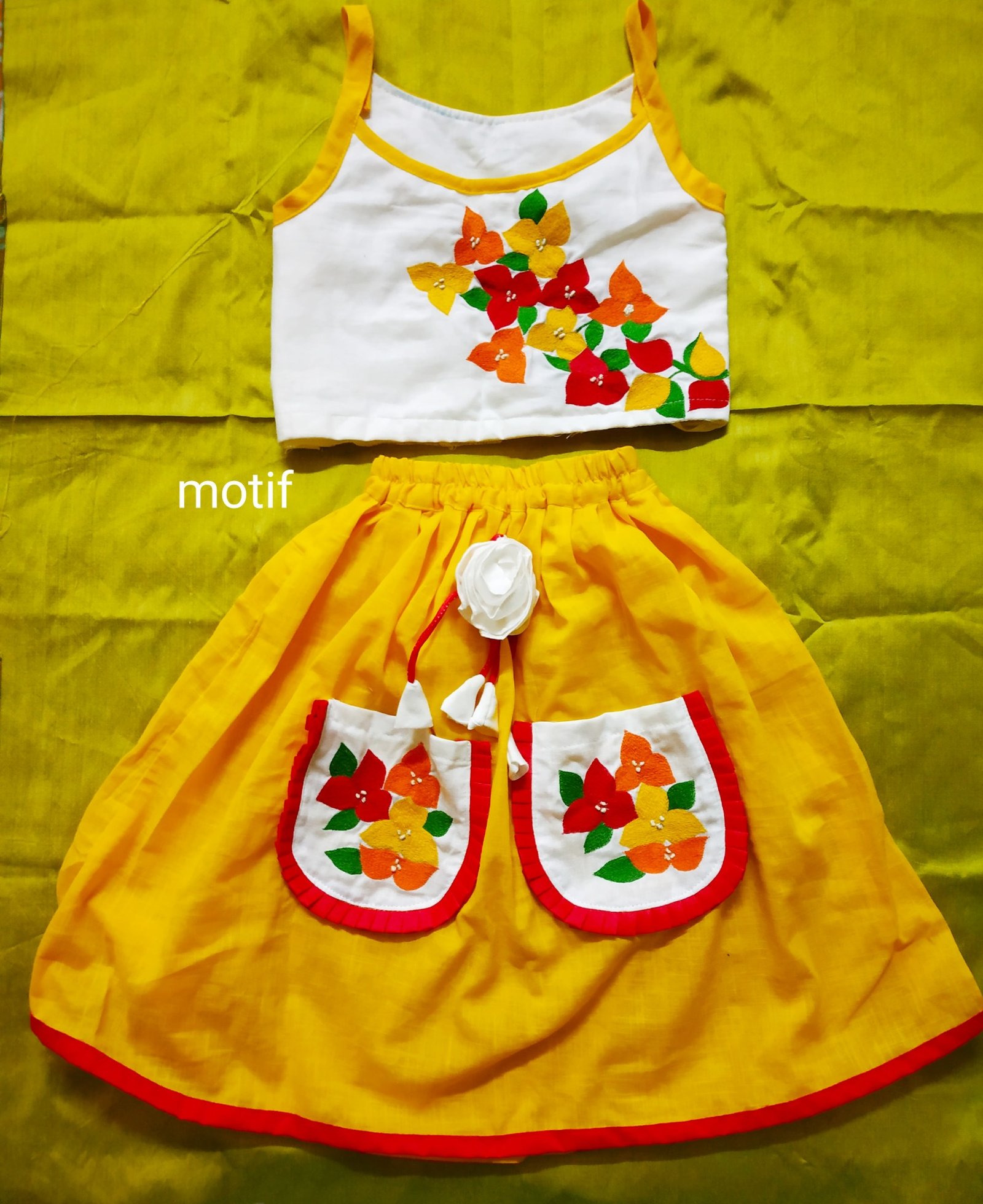 The Bougainvillea Skirt Top is a charming made-to-order kids’ ensemble featuring vibrant bougainvillea embroidery on both the top and skirt. Designed with two functional pockets adorned with frill detailing and matching embroidery, this outfit blends comfort with elegance. The back of the top can be personalised with the child’s name, making it a perfect choice for festive wear, birthdays, and special occasions.