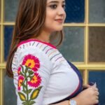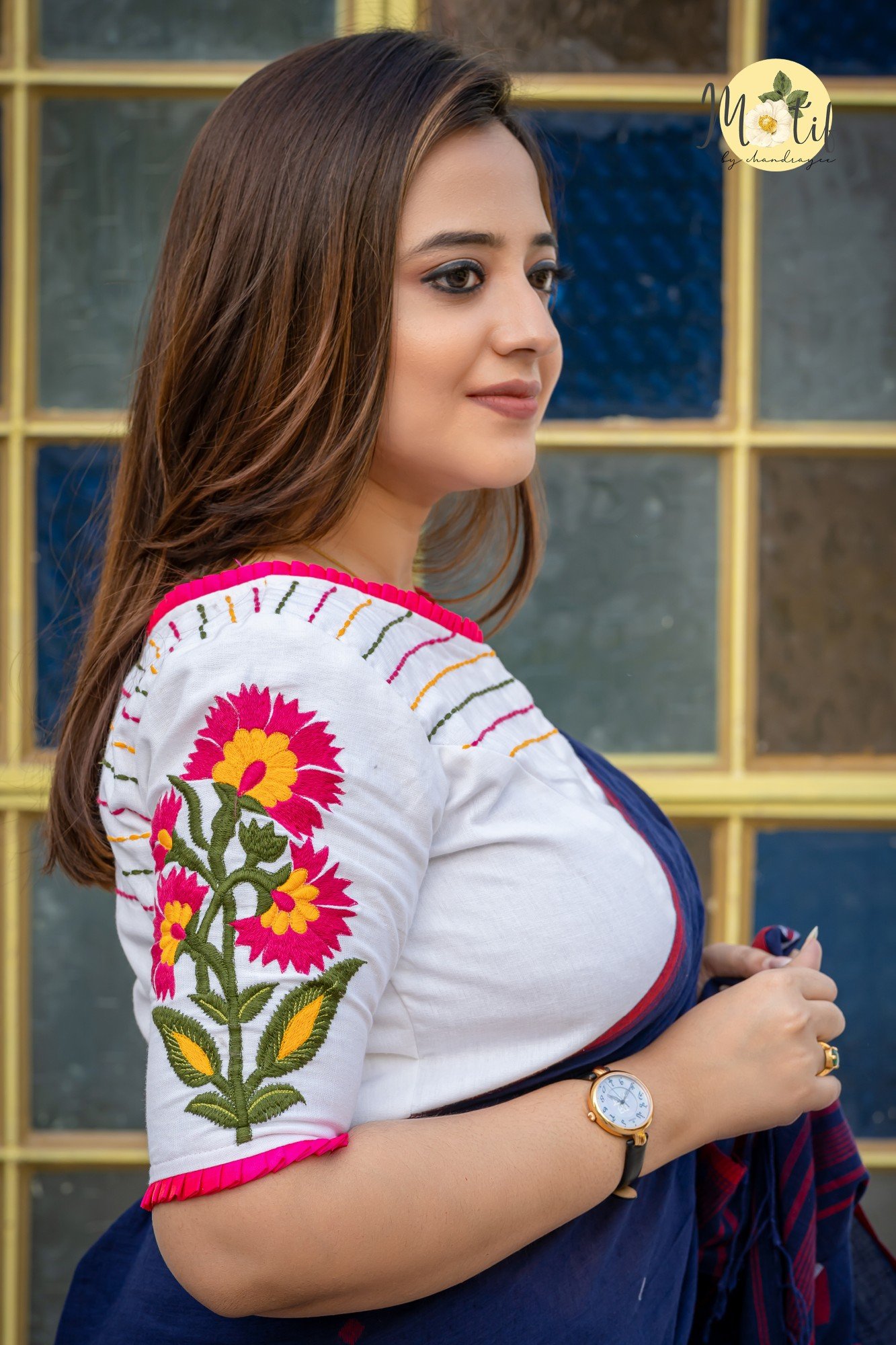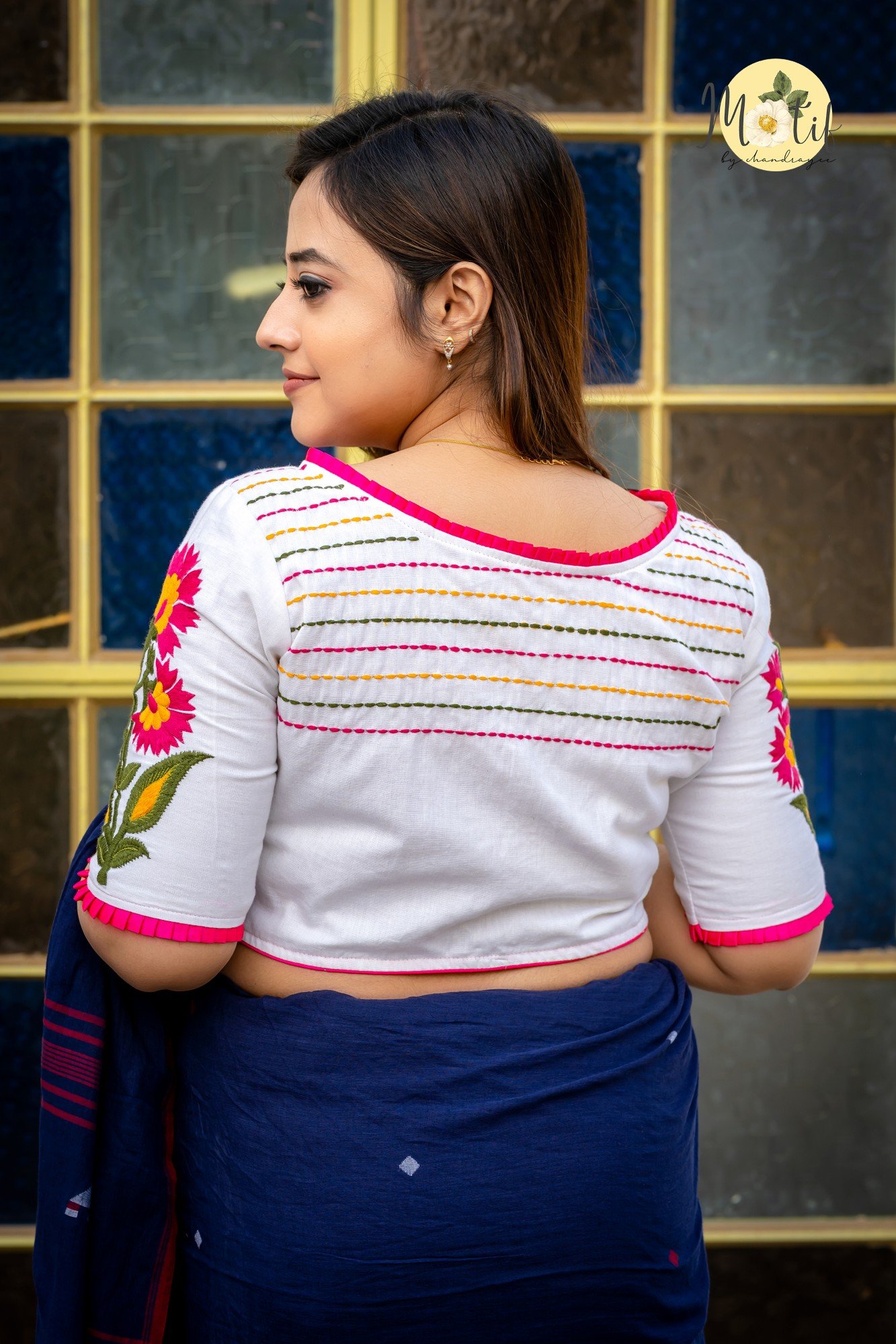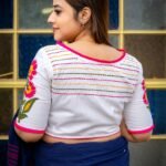 Chandramallika is a graceful white boat-neck blouse adorned with vibrant Rani pink and yellow floral embroidery on the sleeves. Designed with delicate frill detailing on the neckline and sleeves, elegant glass sleeves, and neat front & back anchoring, this non-padded blouse ensures structure, comfort, and beauty. With a secure front hook closure, it pairs effortlessly with cotton, linen, and handloom sarees, making it a perfect choice for festive wear, office elegance, and everyday sophistication.