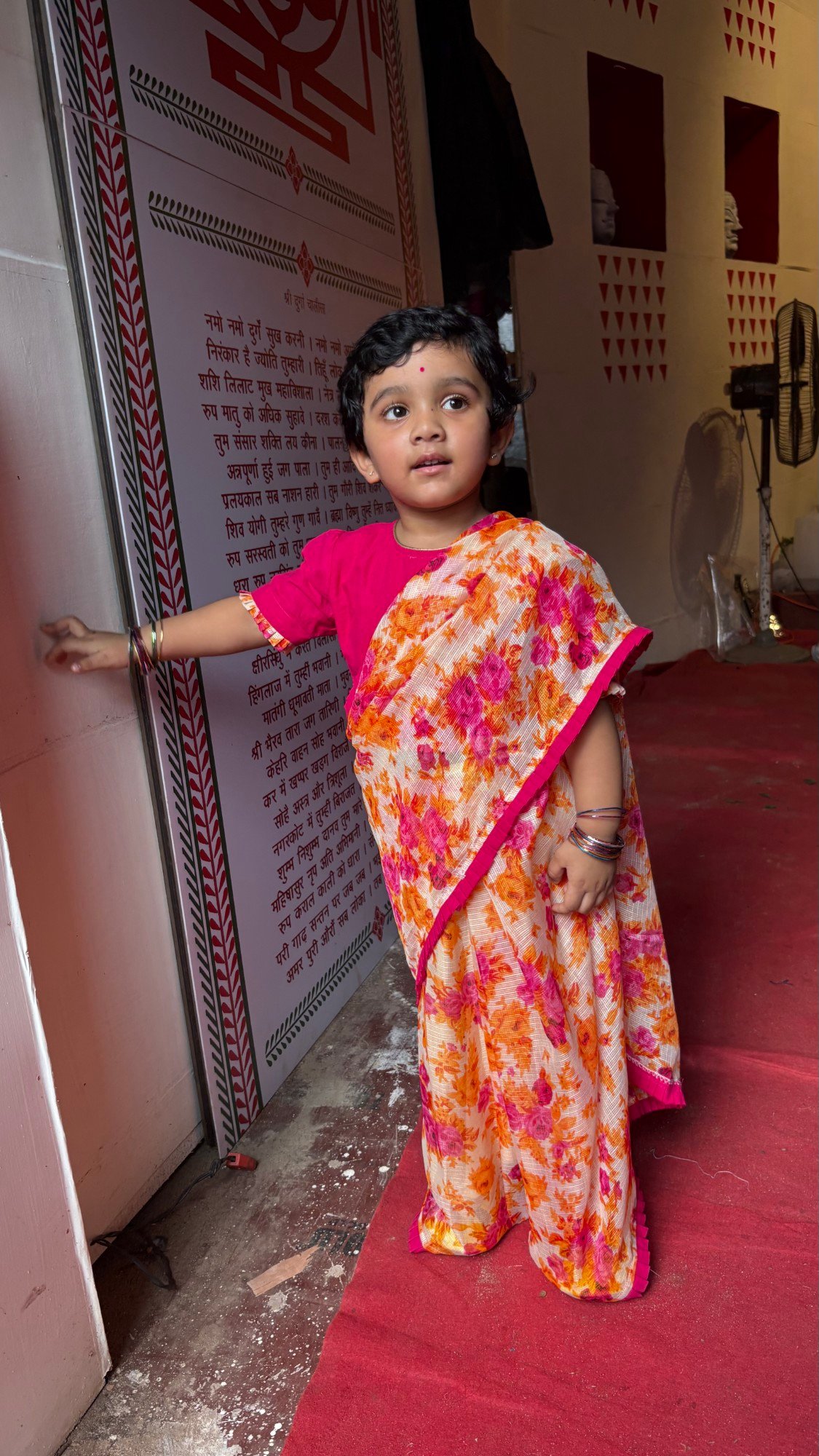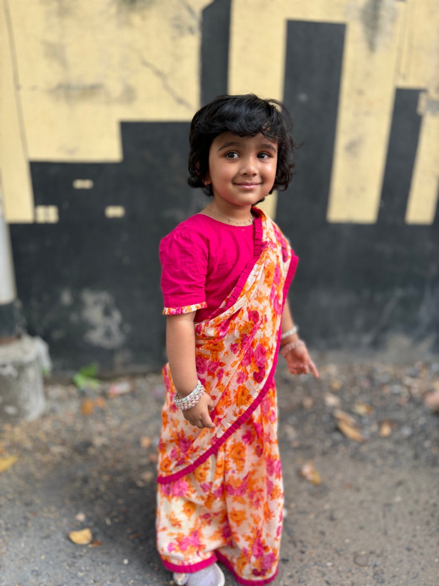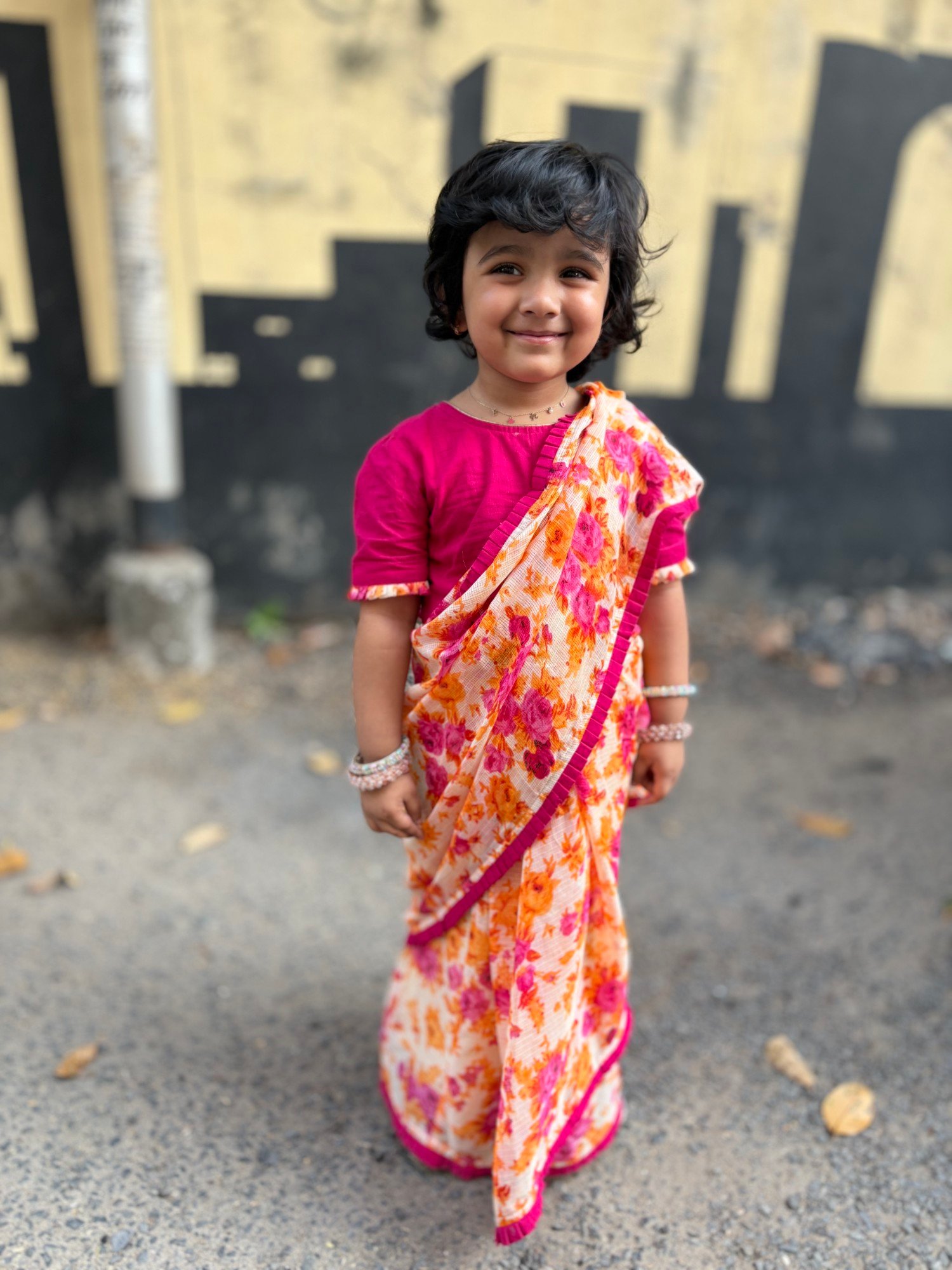 This charming Kota kids saree features soft floral prints with playful frill detailing, paired with a vibrant contrast blouse finished with cute latkans. Lightweight and comfortable, it’s perfect for festive occasions, birthdays, and special celebrations—bringing traditional style in a fun, child-friendly way.