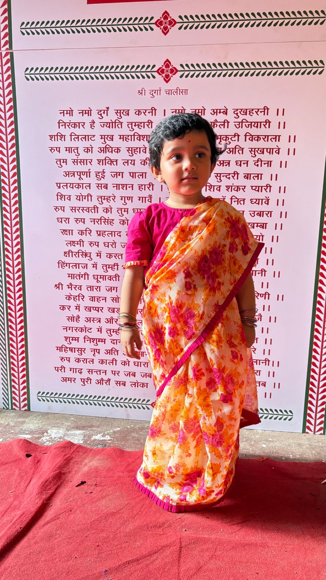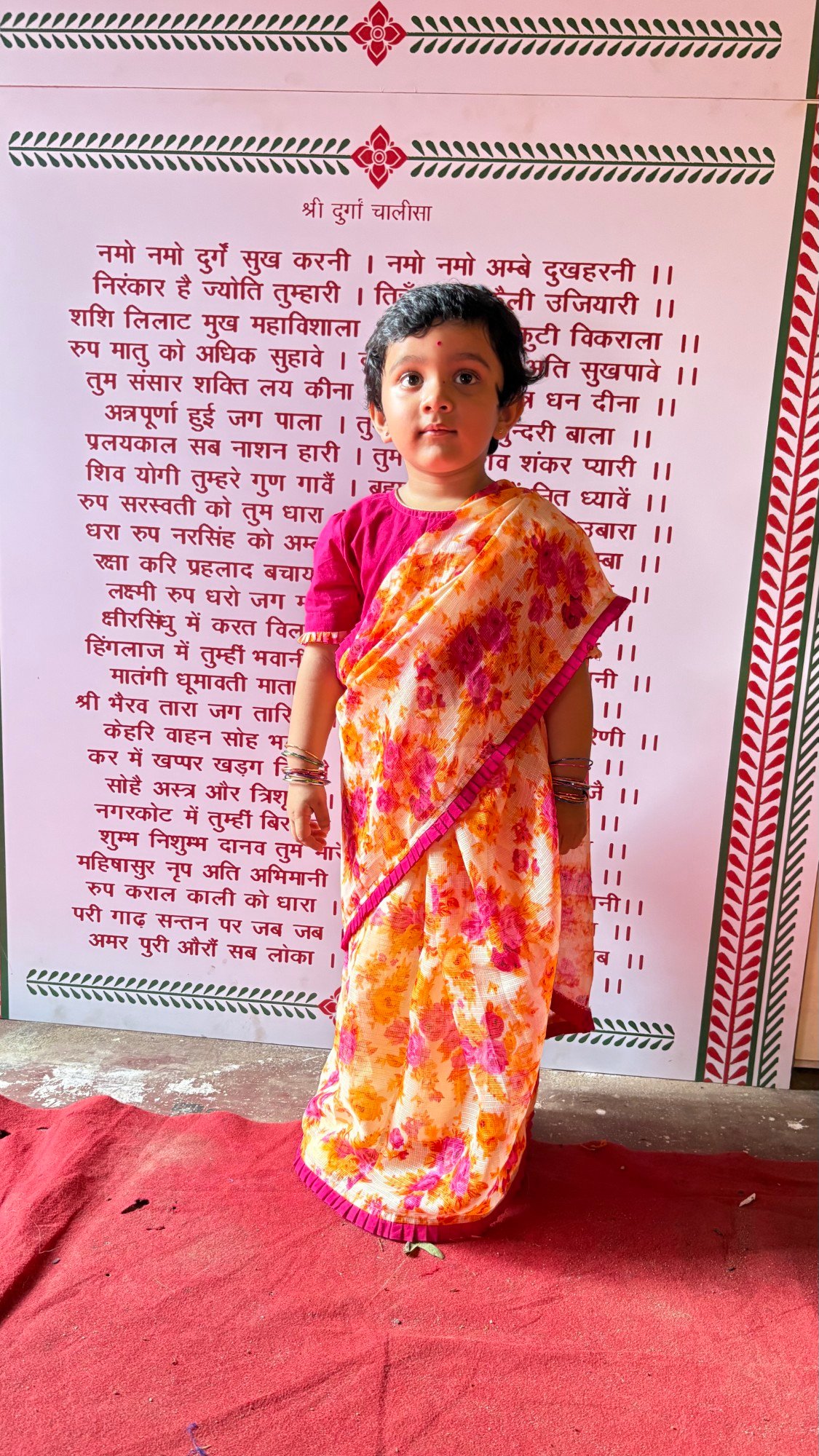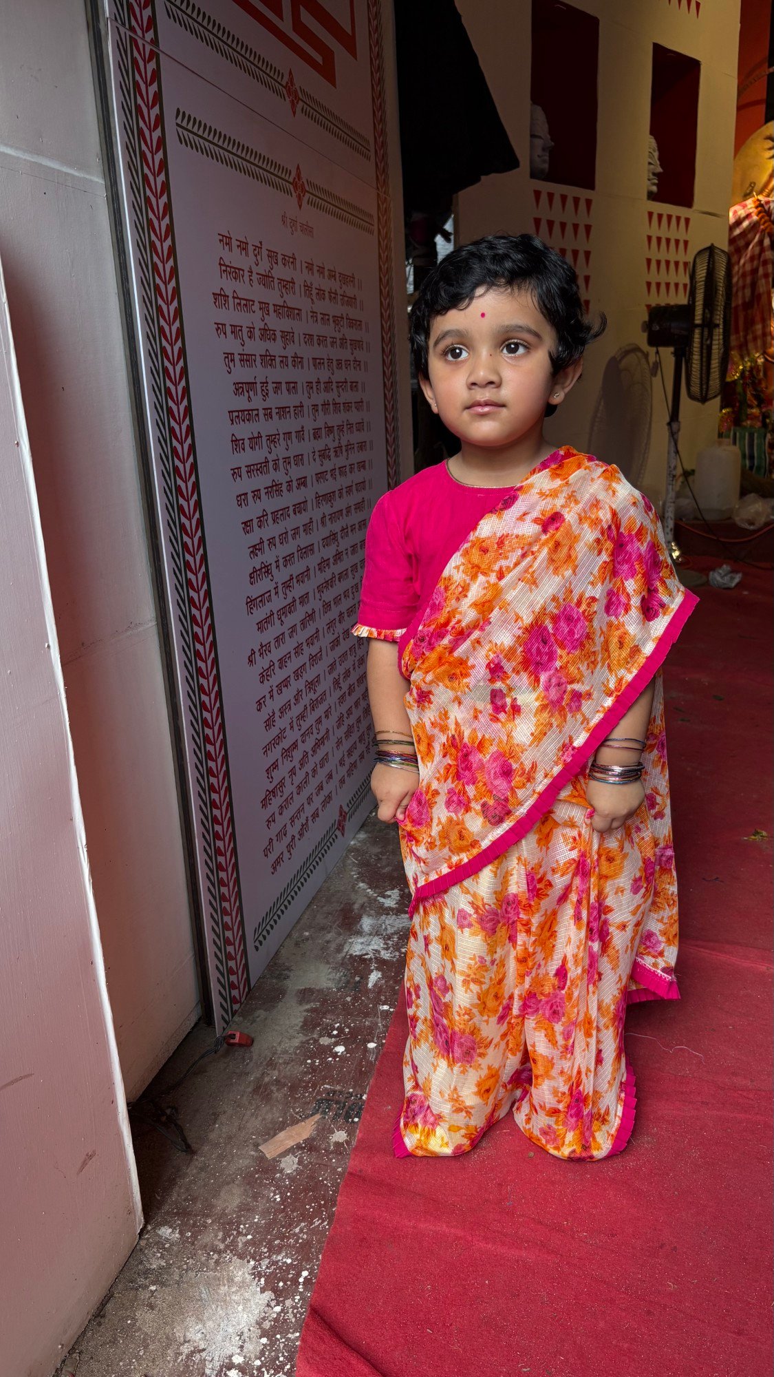 This charming Kota kids saree features soft floral prints with playful frill detailing, paired with a vibrant contrast blouse finished with cute latkans. Lightweight and comfortable, it’s perfect for festive occasions, birthdays, and special celebrations—bringing traditional style in a fun, child-friendly way.
