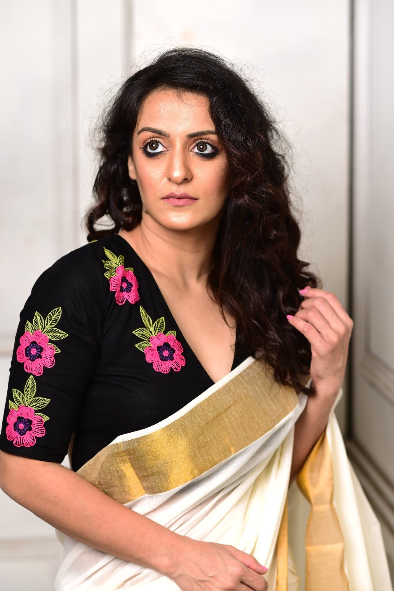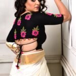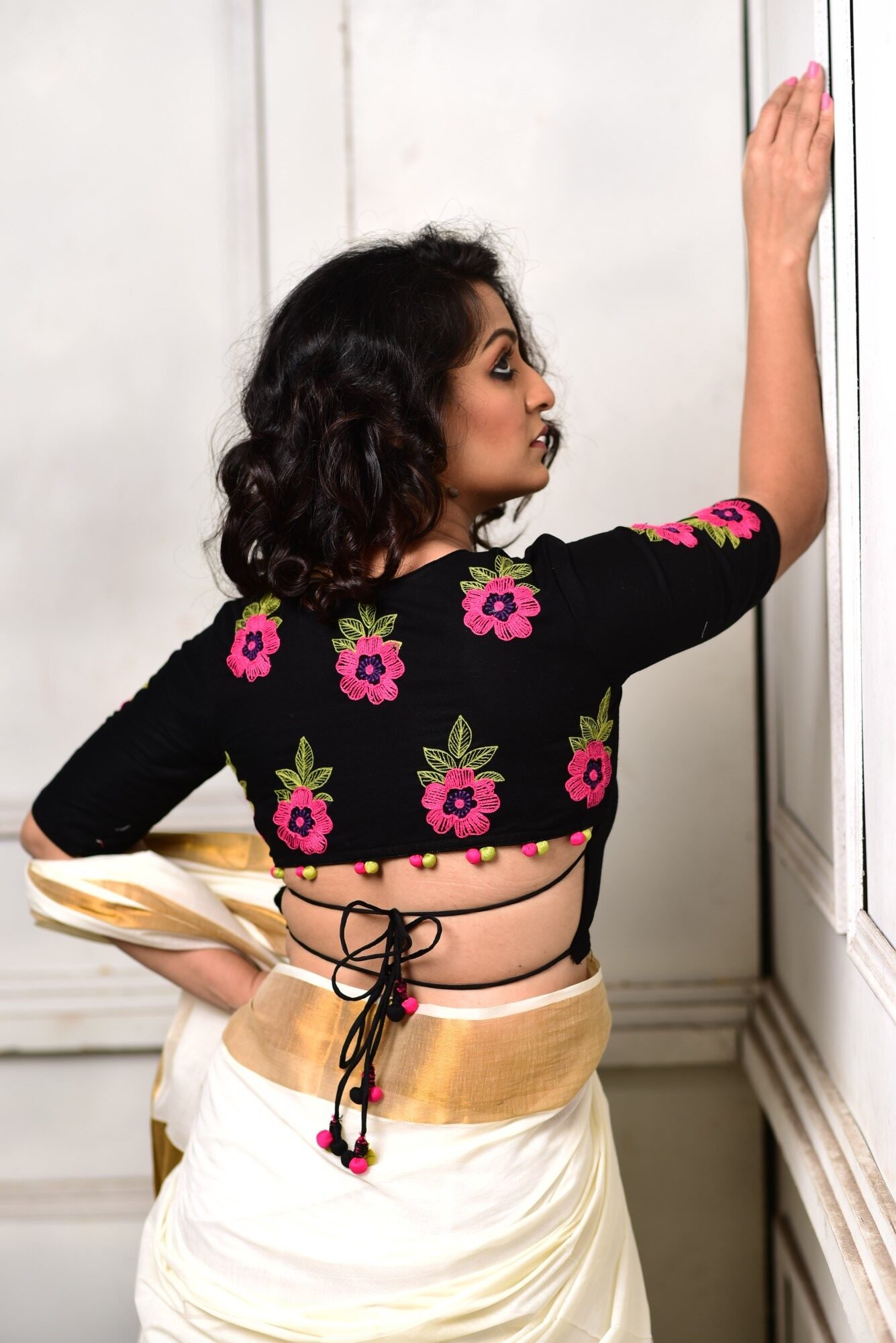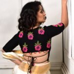 The Fuchsia Charm Back Tie Blouse is a handcrafted black blouse adorned with exquisite fuchsia dori-embroidered flowers and leafy motifs scattered gracefully across the back. Designed with elegant double back tie-ups and playful fabric ball detailing, this blouse blends contemporary flair with traditional artistry. The deep V-neck, glass sleeves, contrast cord piping, and front-neck dori embroidery add refined sophistication. Made in premium handloom cotton and fully padded with a front enclosure, this blouse is the perfect statement piece for festive wear, weddings, and ethnic styling.