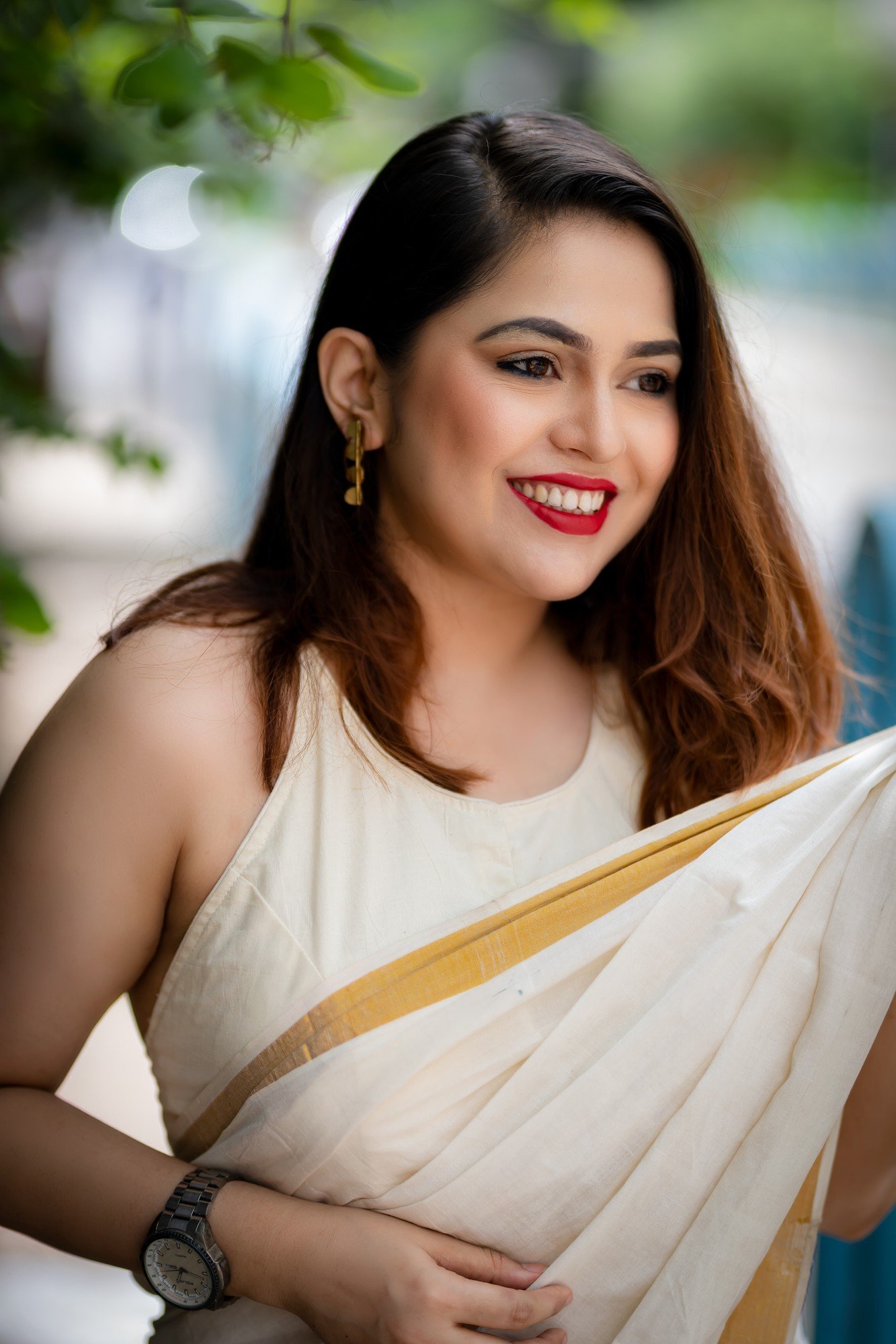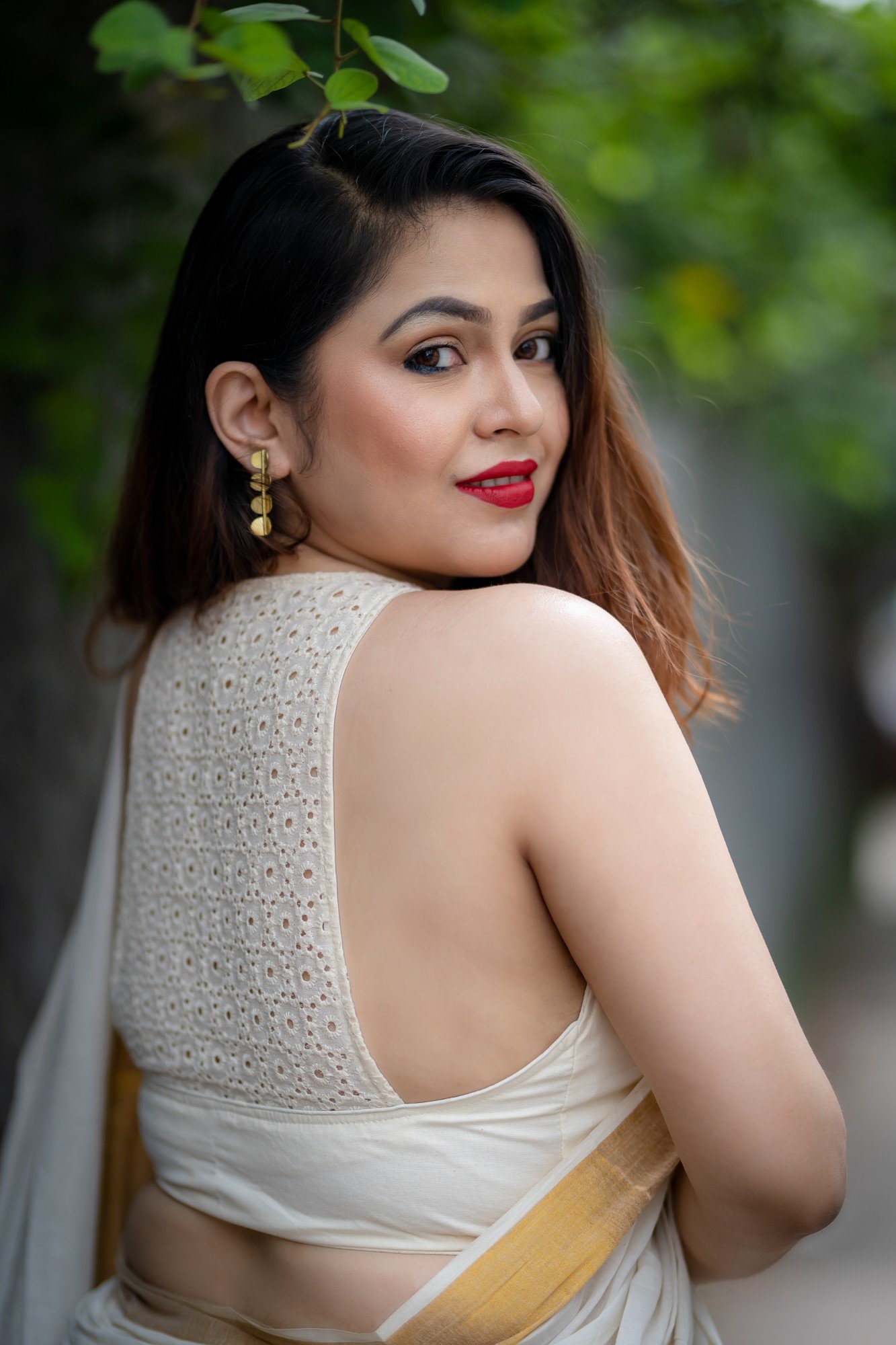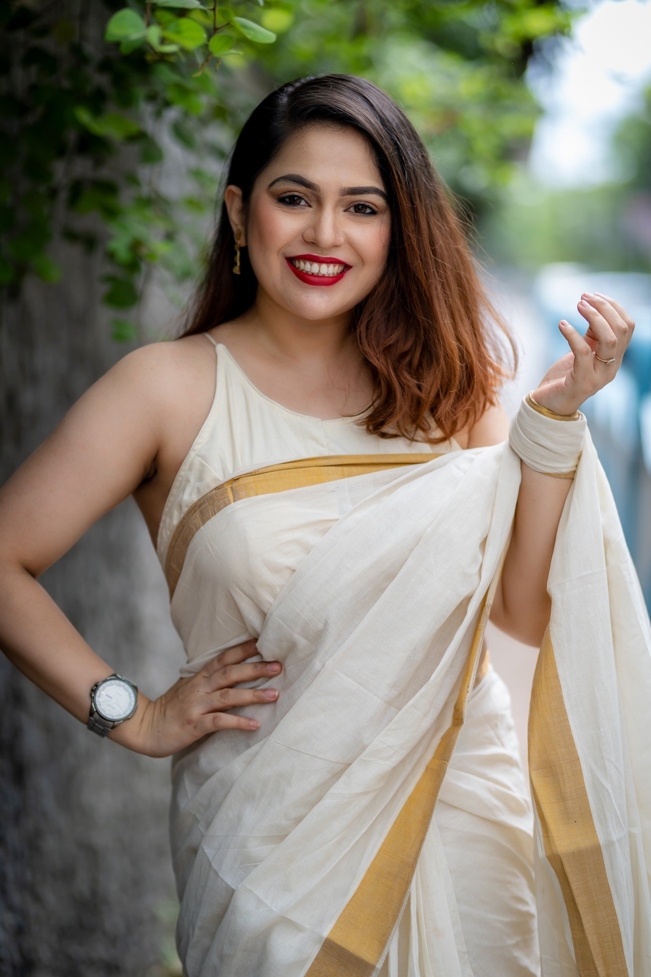 - Ivory/cream tone that pairs beautifully with traditional Kerala sarees