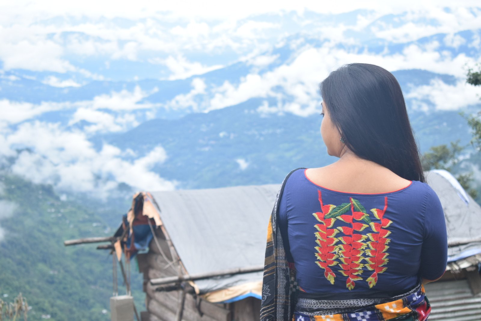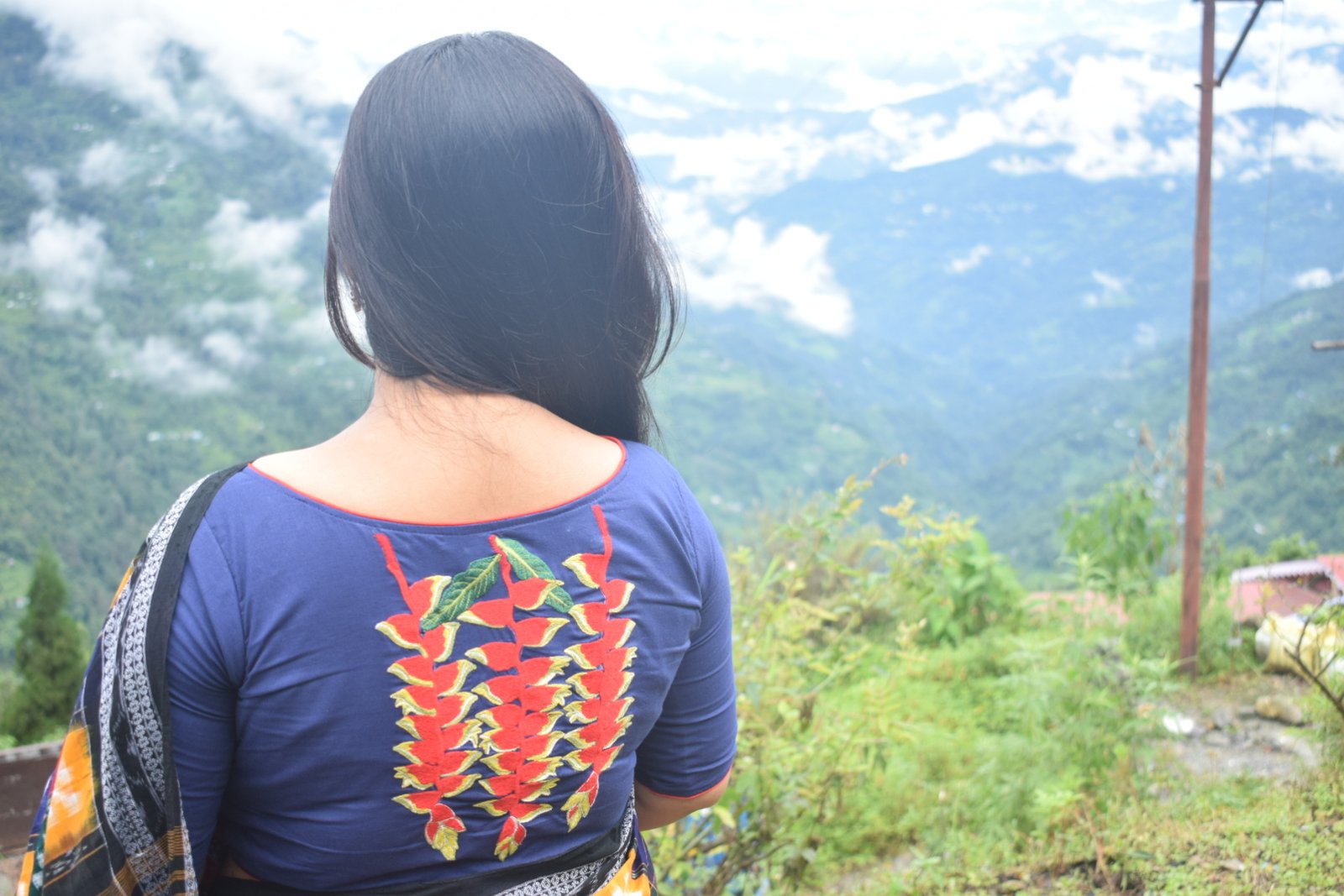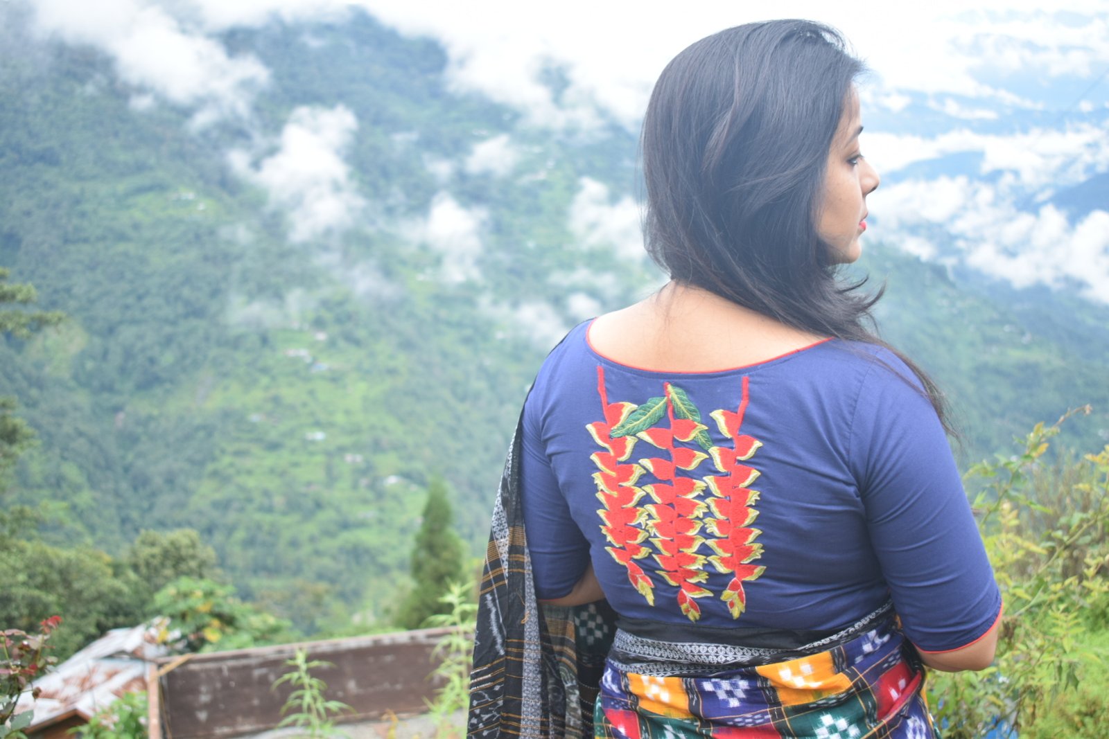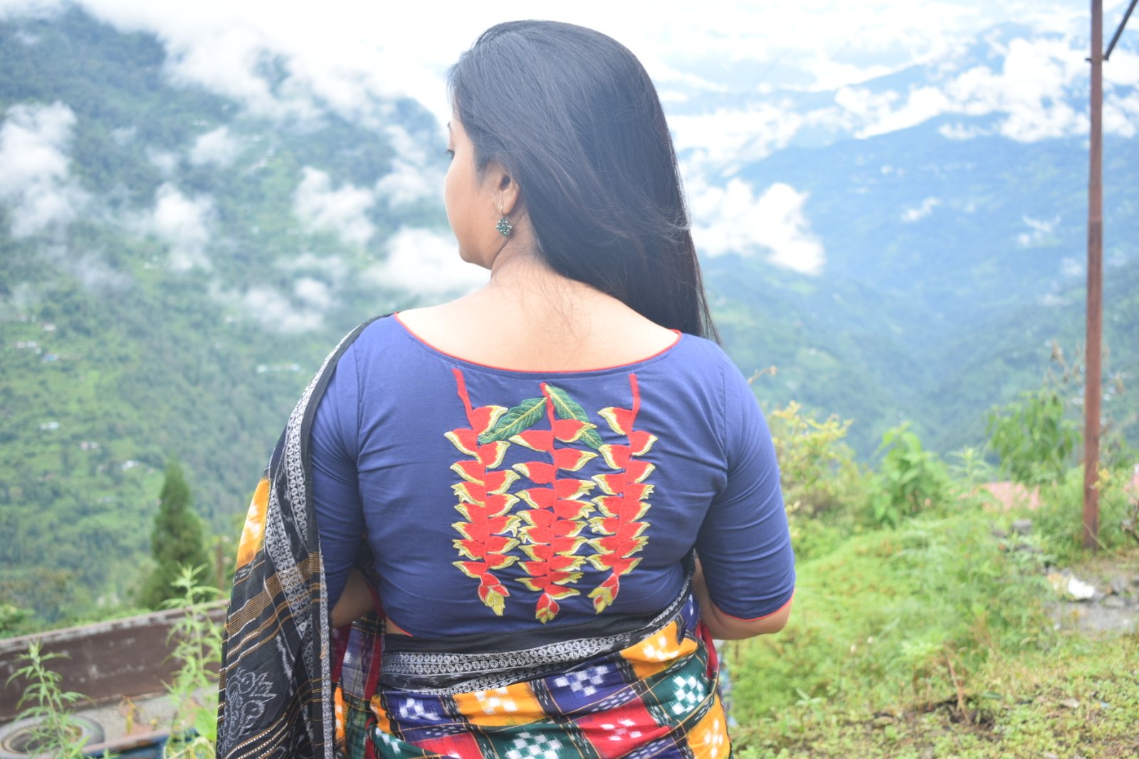 Inspired by the beauty of tropical blooms, the Heliconia Blouse is crafted on a rich navy blue Rich Cotton silk / Premium Khadi Cotton with stunning embroidered heliconia flowers cascading gracefully down the back. Each motif reflects exquisite craftsmanship and vibrant artistry, blending modern style with traditional embroidery.
