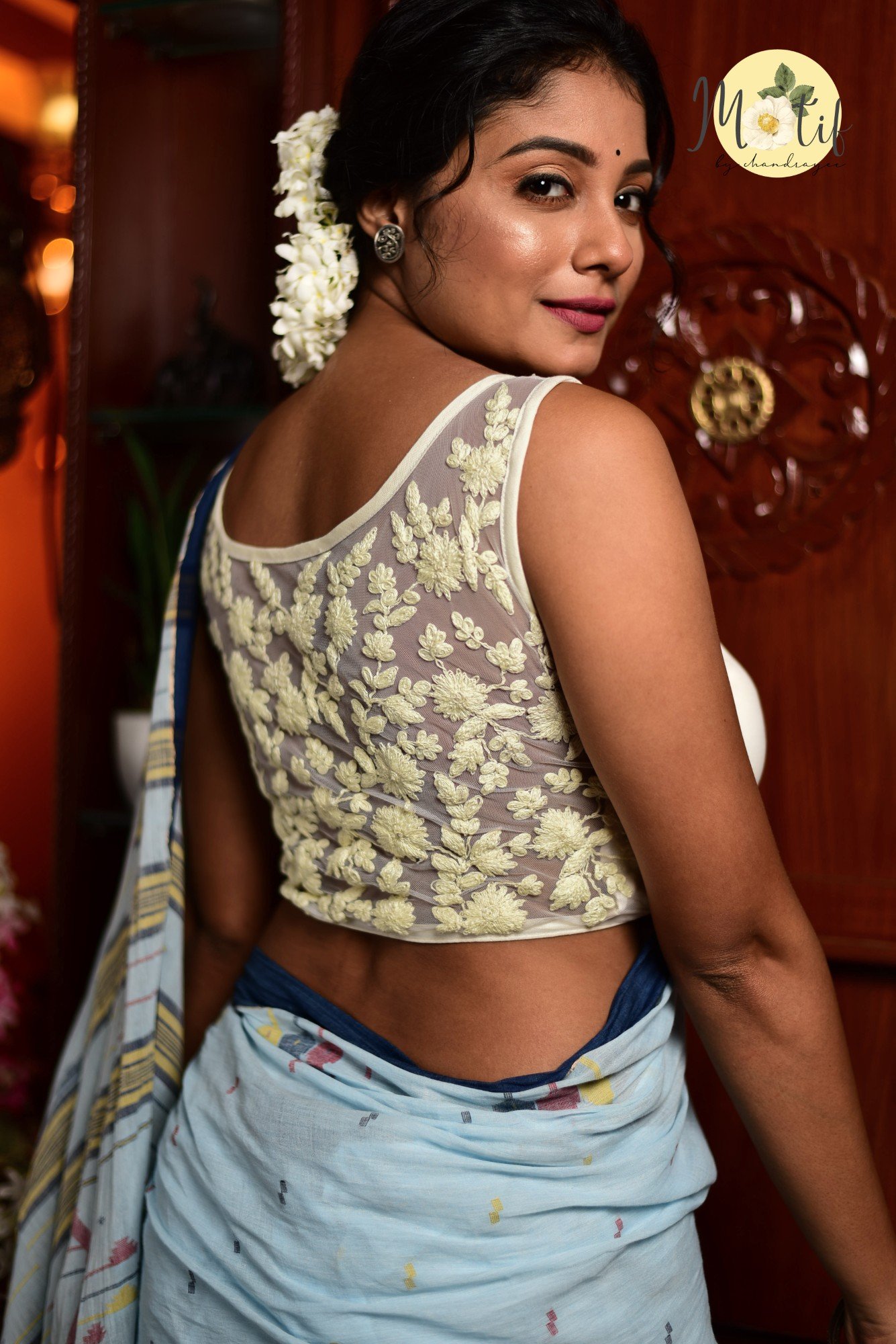 Perfectly tailored with a sleeveless cut and classic neckline, this blouse pairs beautifully with silk, organza, or linen sarees, lending a dreamy, feminine touch to your ethnic look. A must-have for those who love understated elegance with a luxurious edge.