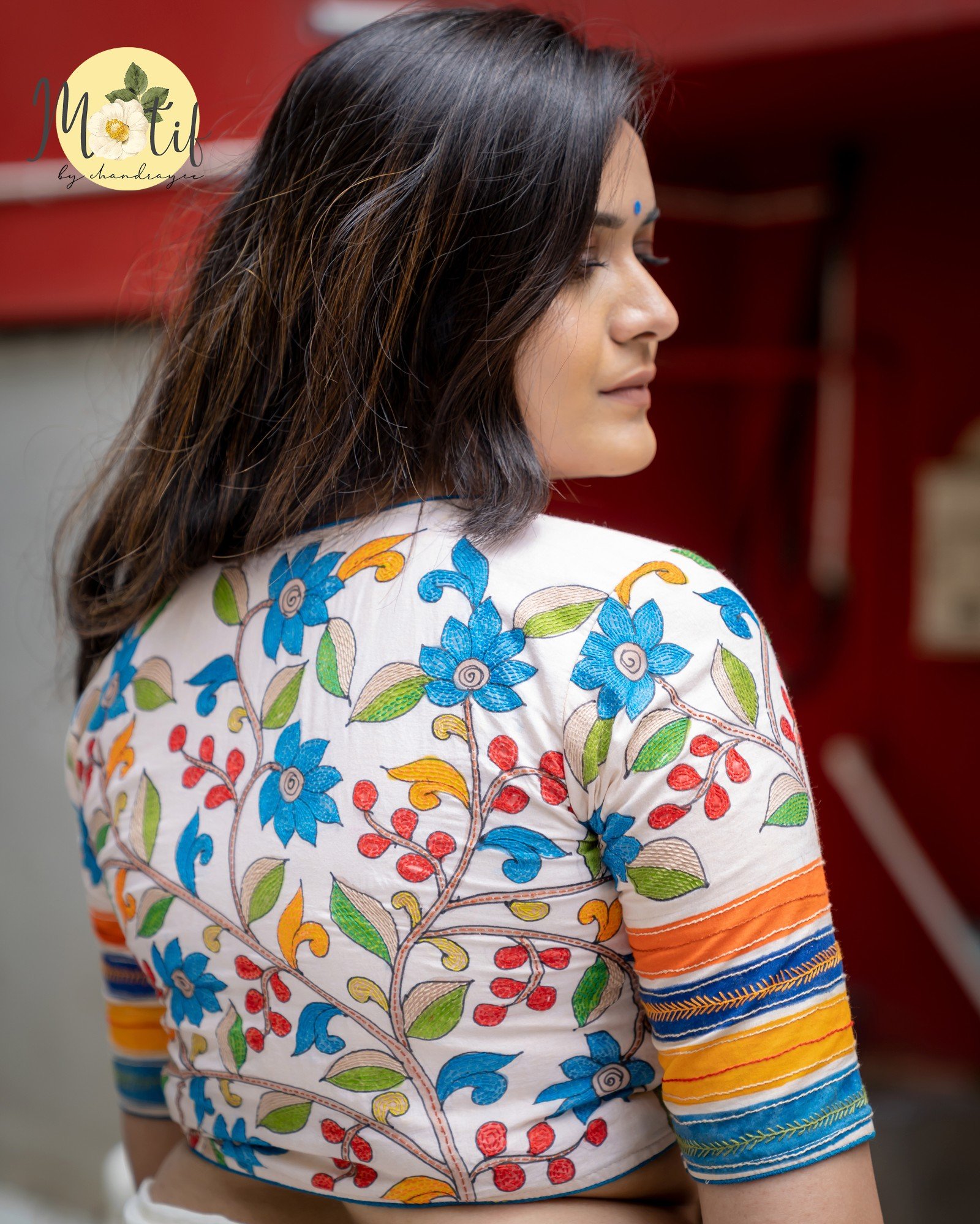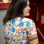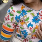 Kalamkari Classic is a refined handcrafted blouse that celebrates traditional artistry with a contemporary finish. Set on a rich Premium khadi cotton base, it features hand-drawn pen Kalamkari motifs, carefully executed to preserve the authenticity of the craft. Subtle yet striking Kantha hand embroidery highlights the motifs, adding depth, texture, and character. The blouse is designed with a close neck, accentuated by contrast blue cord piping, and finished with a practical front enclosure, making it both elegant and wearable.