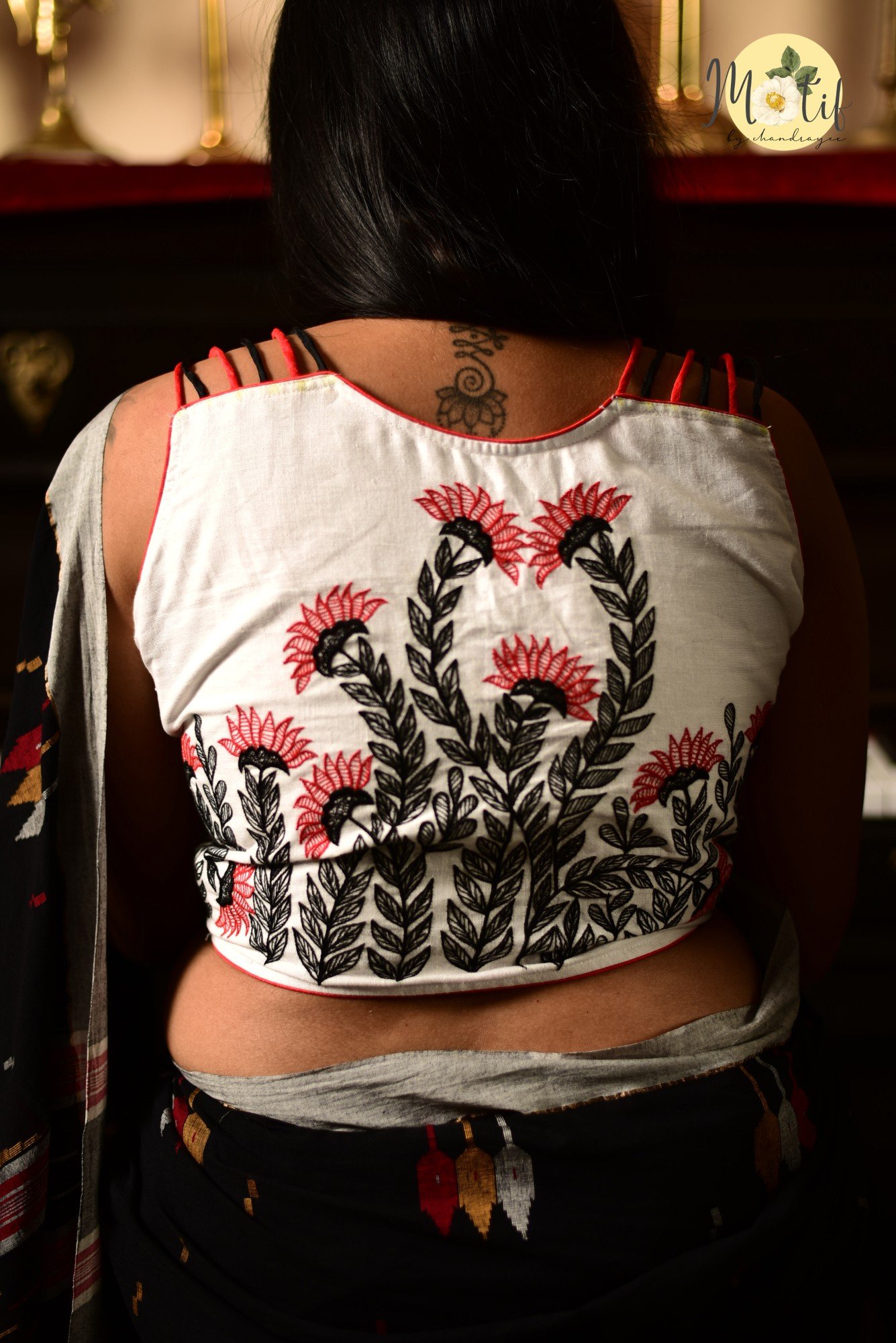 The Madhubani White Blouse is a stunning fusion of folk art and modern style. Crafted in breathable Khadi linen / khadi Cotton, it features intricate Madhubani embroidery in black and red threads on a pristine white base. Adding a touch of contemporary elegance, the blouse is designed with stylish red and black shoulder straps, which not only enhance the overall look but also bring comfort and sophistication.