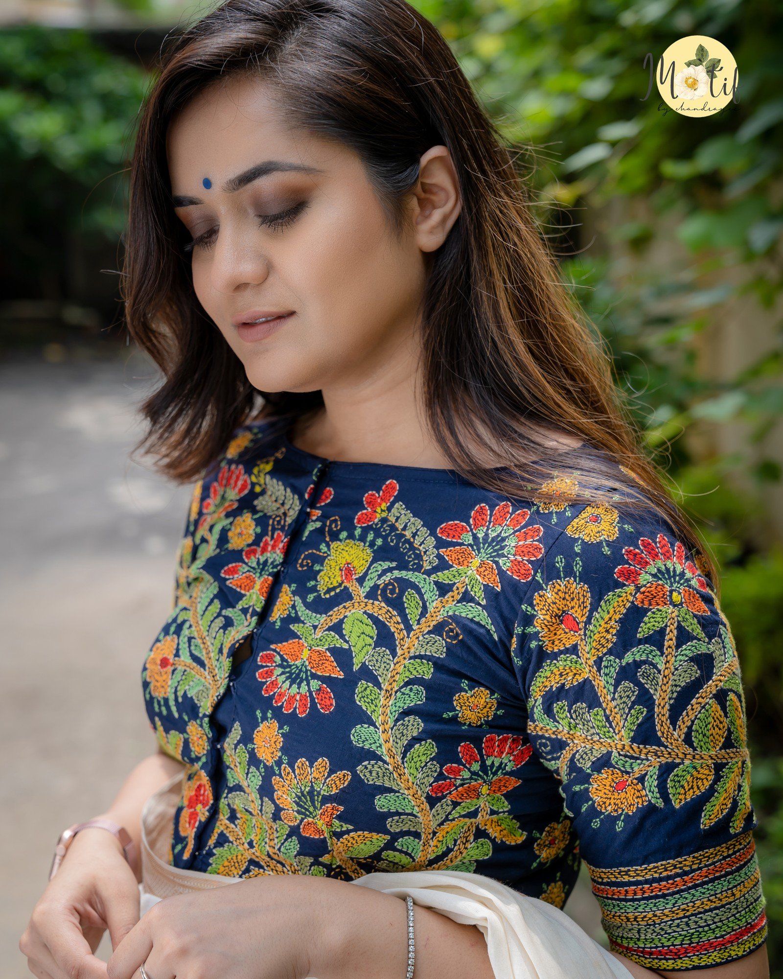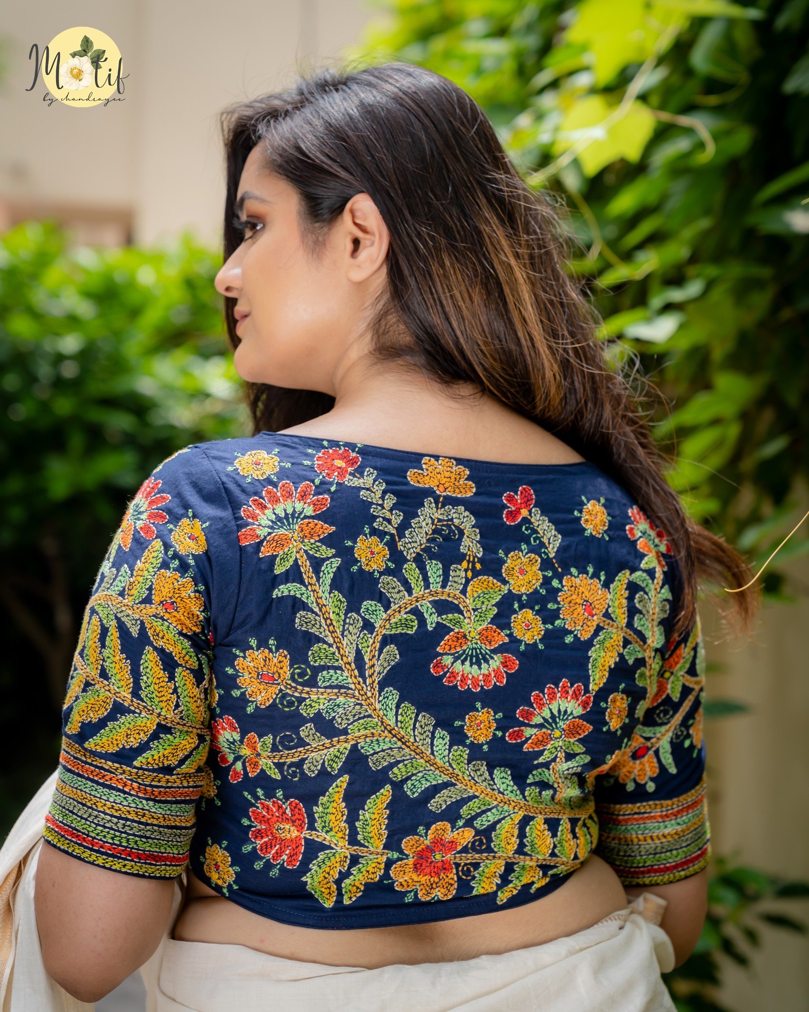- Elegant contrast of vibrant embroidery on rich midnight blue