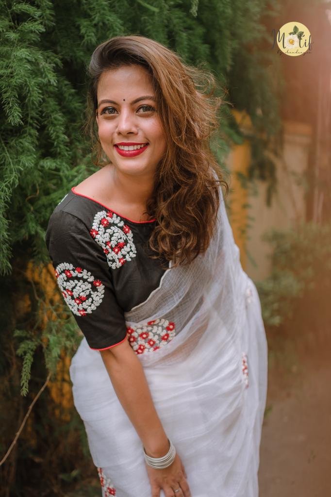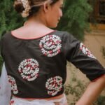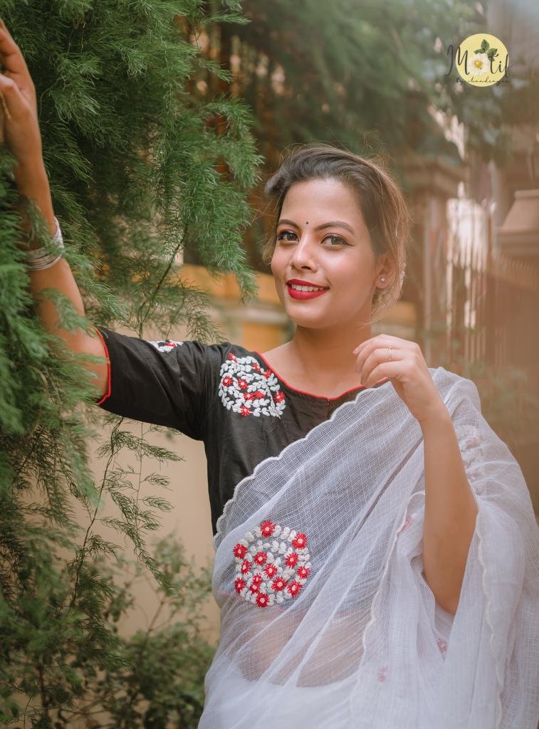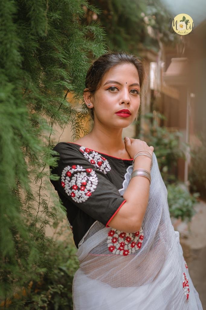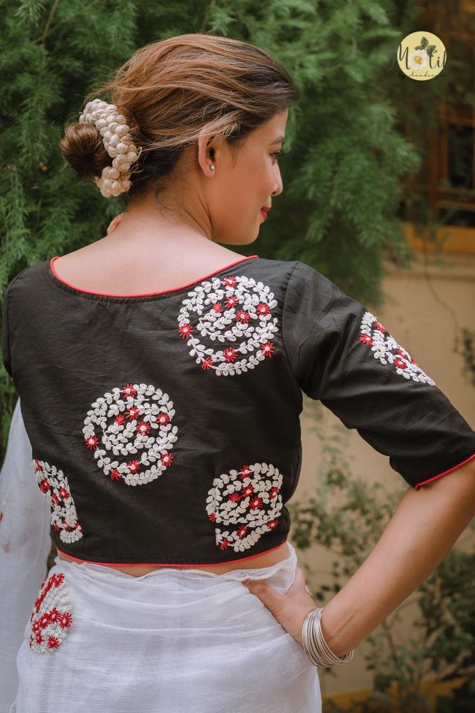 The Mahasweta Blouse is an elegant handcrafted piece featuring intricate red and white floral vine motifs, arranged in beautifully detailed circular patterns. These dori-embroidered clusters are thoughtfully placed across the back, front right, and sleeves, creating a rich yet balanced aesthetic. Crafted on luxurious cotton silk or khadi cotton, the blouse showcases a timeless boat neckline, a comfortable front enclosure, and subtle contrast cord piping that enhances its tailored silhouette.