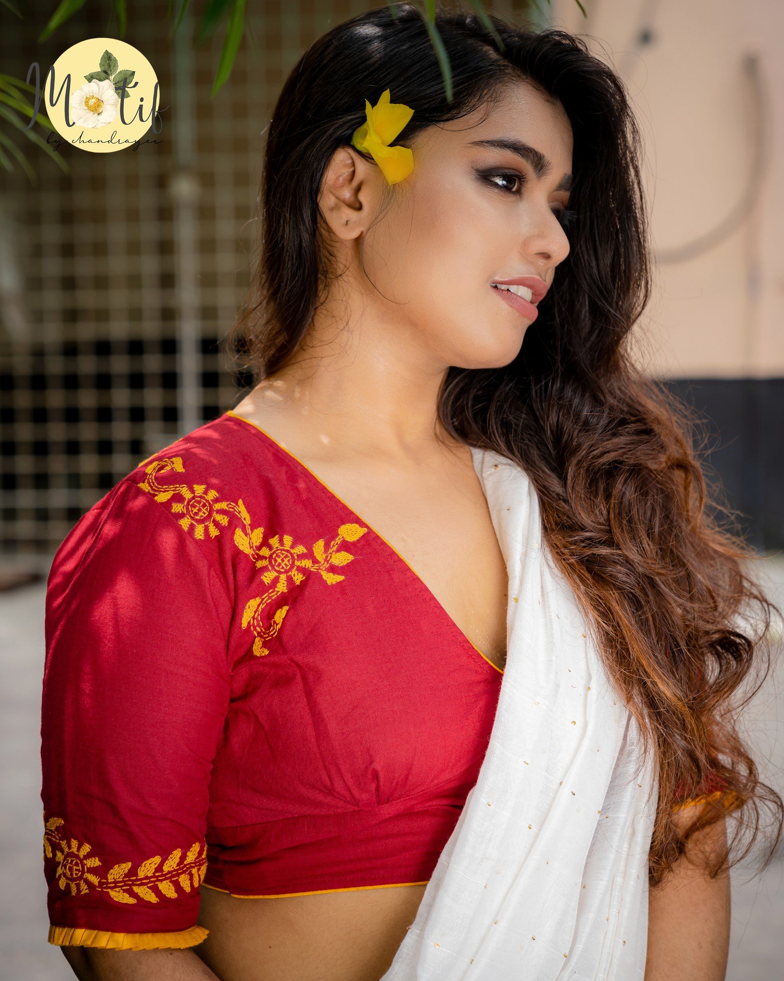 The Maroon Aura blouse features a deep V plunging neckline, beautifully highlighted with yellow ochre cord piping and matching frills on the sleeves. Delicate yellow ochre hand embroidery adorns the back of the blouse, the front neckline, and the sleeve hems, adding depth and handcrafted charm. Designed with a front hook enclosure and a non-padded finish, this blouse balances bold design with artisanal elegance.