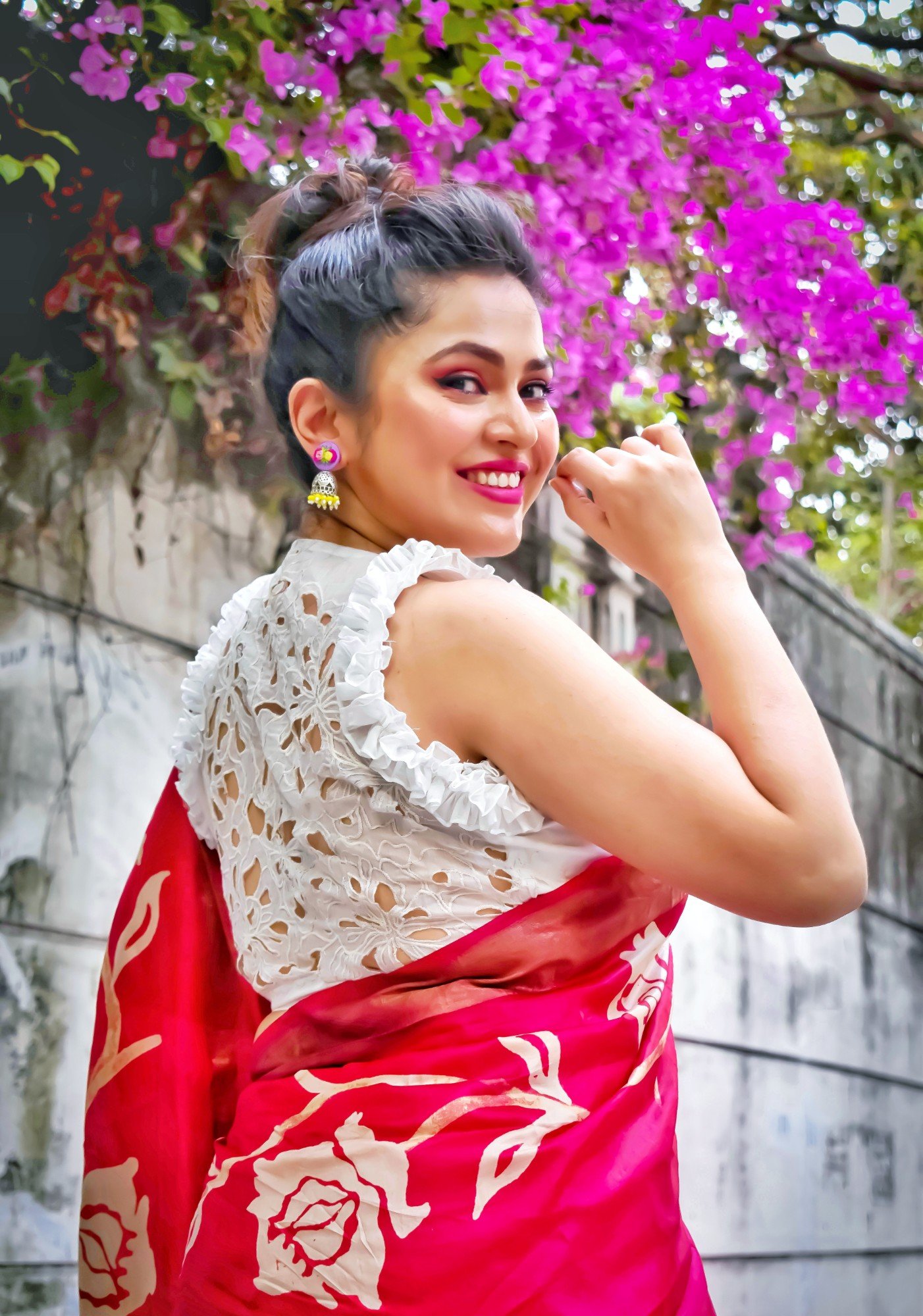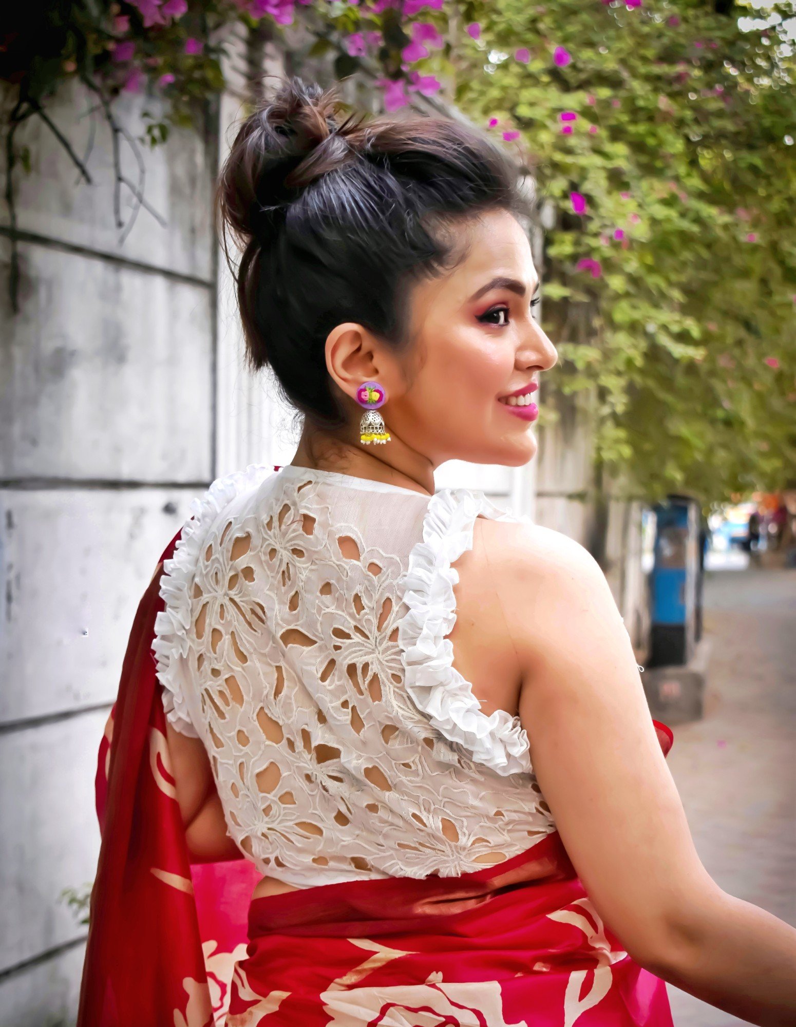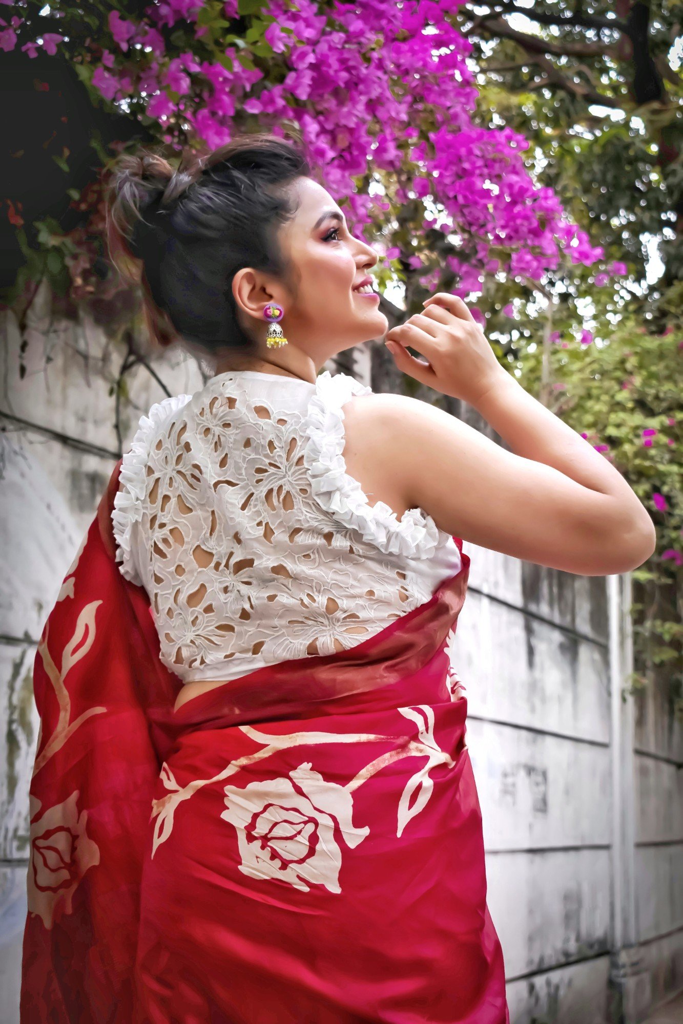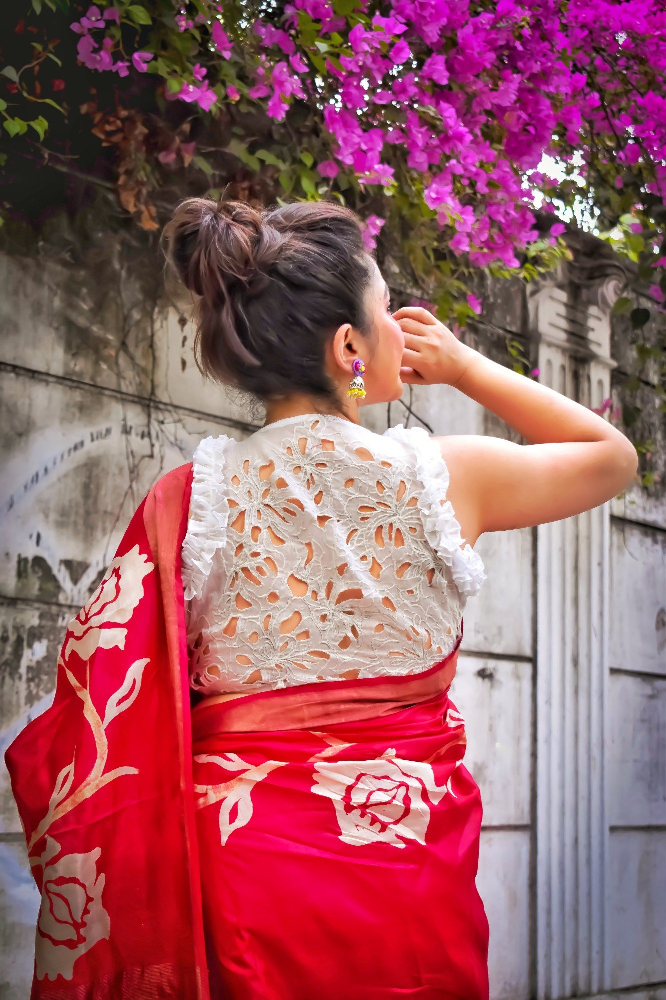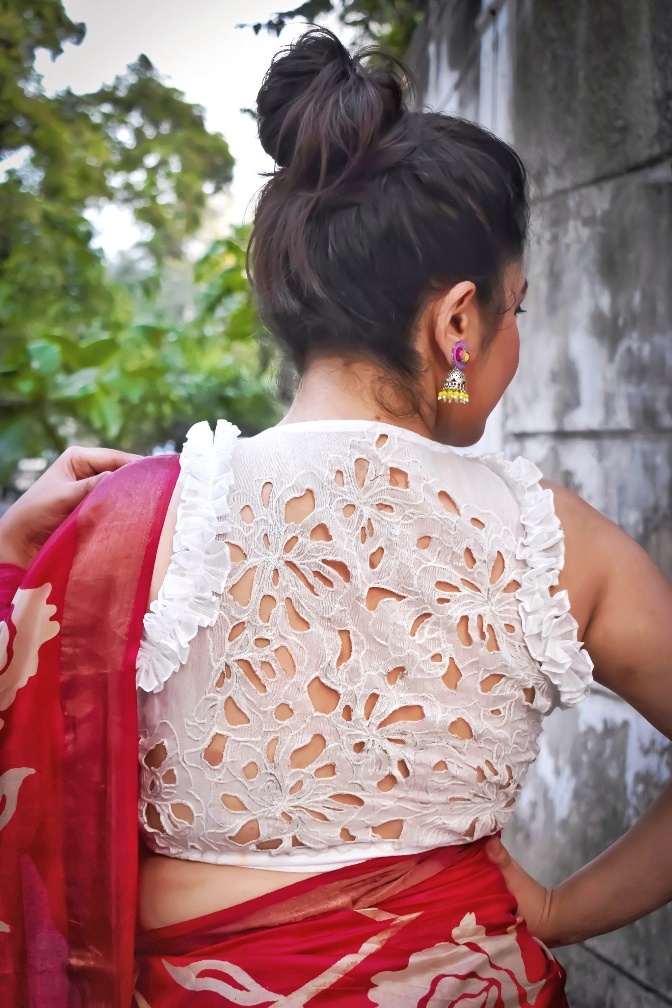 The Marshmallow blouse is crafted in rich white Chanderi silk, designed to exude understated elegance and contemporary charm. Featuring delicate cutwork detailing across the blouse, the intricate patterns create a beautiful play of texture and light. Soft frill highlights along the edges add a refined, feminine touch, enhancing the blouse’s graceful silhouette. Thoughtfully tailored with padding for added comfort and support, this blouse comes with a secure front hook enclosure, making it both stylish and easy to wear. Perfect for pairing with handloom, festive, or statement sarees, Marshmallow is a timeless addition to your ethnic wardrobe.
