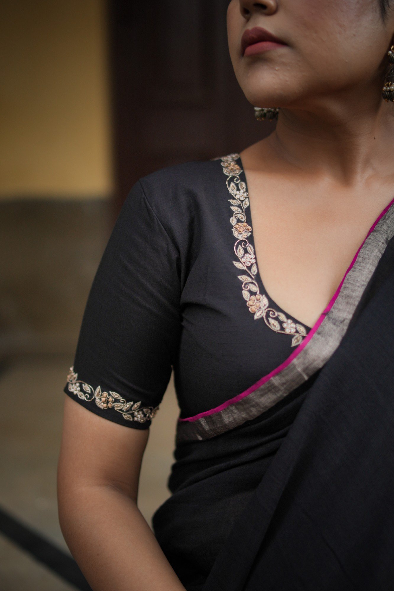 The Midnight Bloom Blouse is an exquisite fusion of luxury and tradition, designed to make every moment special. Tailored in rich silk cotton with a sheer net back, this blouse is adorned with handcrafted zardozi embroidery using zari and tulsi stem techniques. The centerpiece floral motif on the back, framed with a delicate embroidered border, radiates timeless grace, while the zari-detailed neckline and sleeves add a regal touch. Perfect for weddings, festive occasions, or evening celebrations, this blouse brings unmatched sophistication to your ethnic collection.