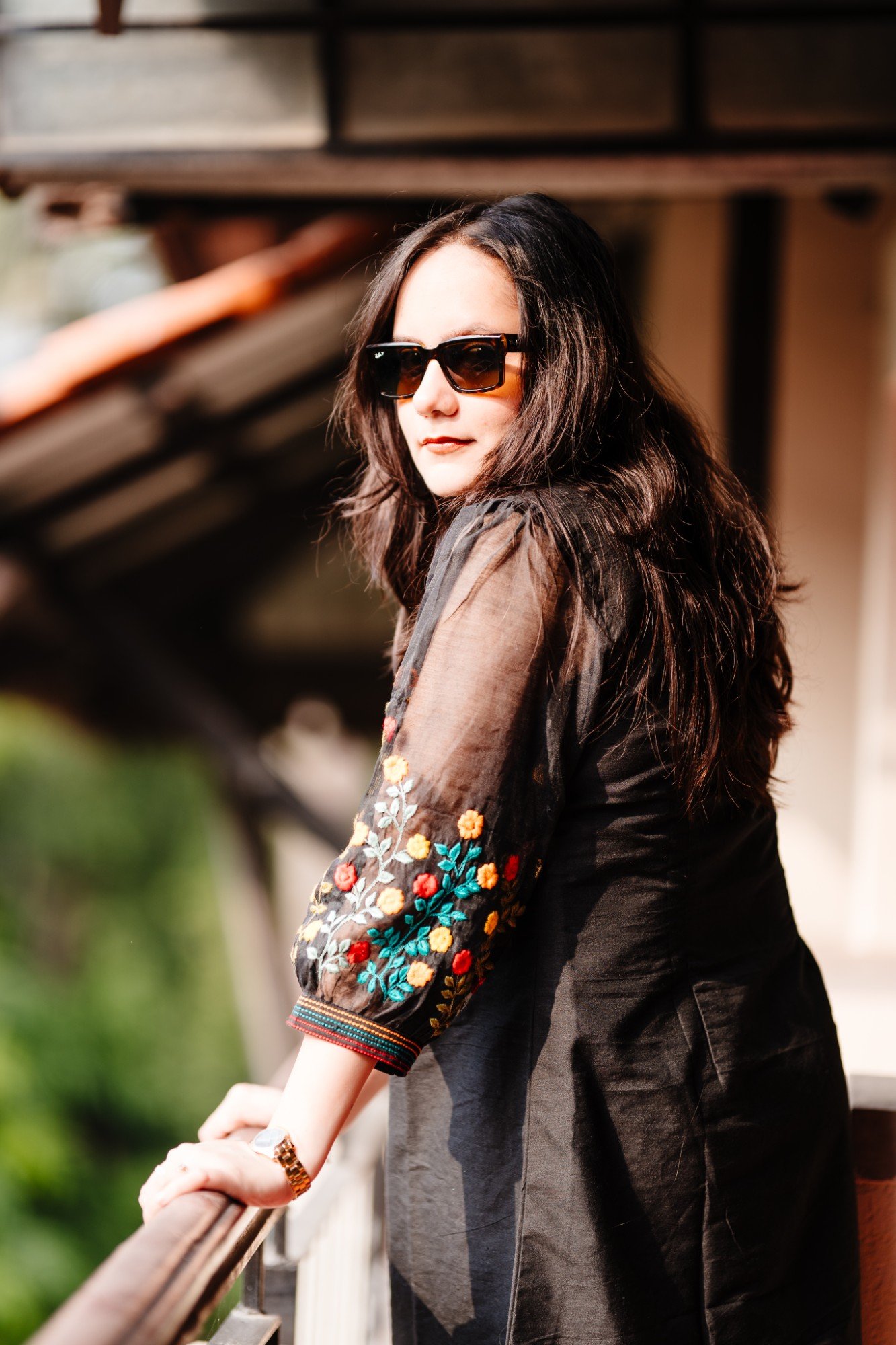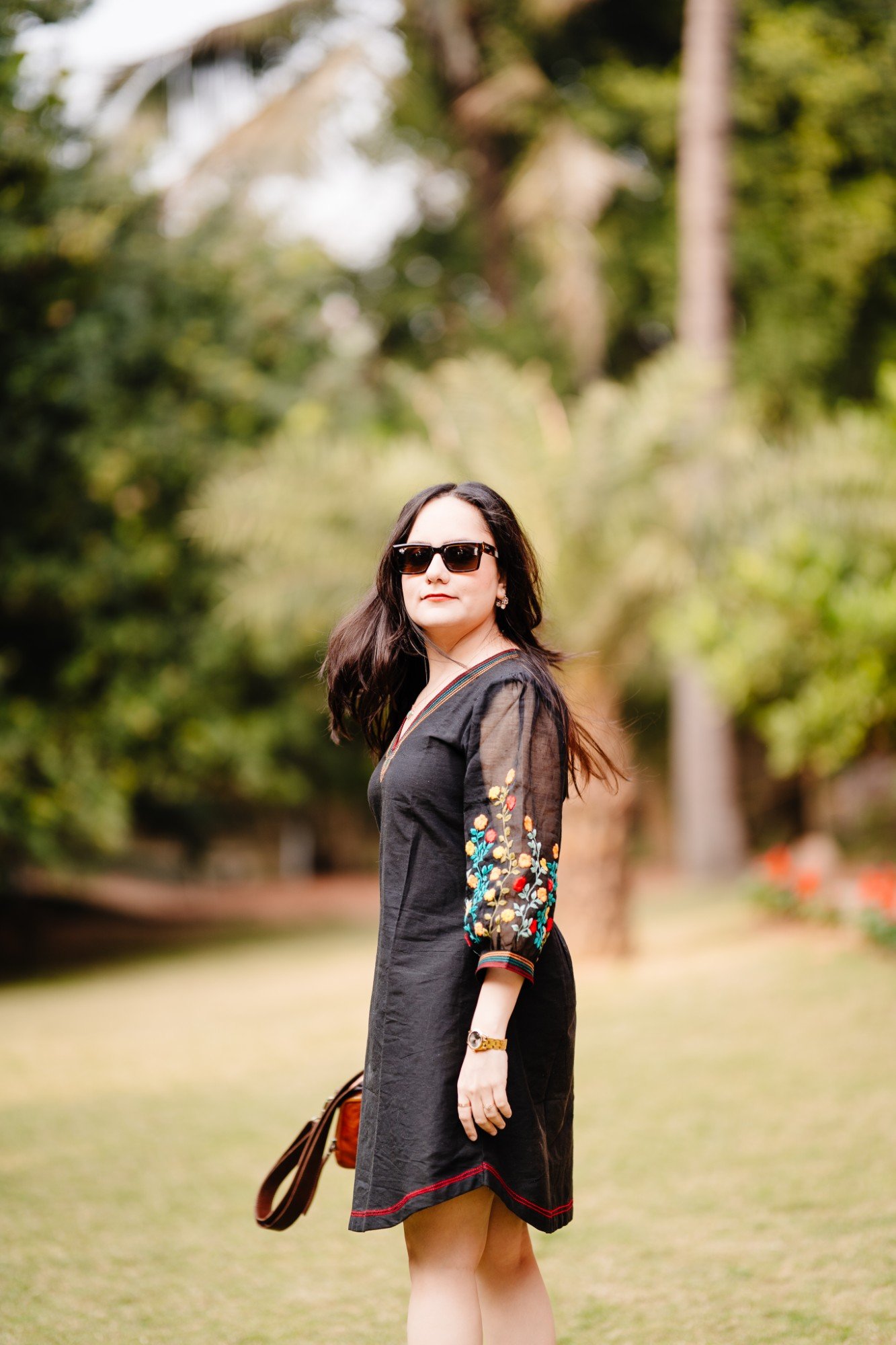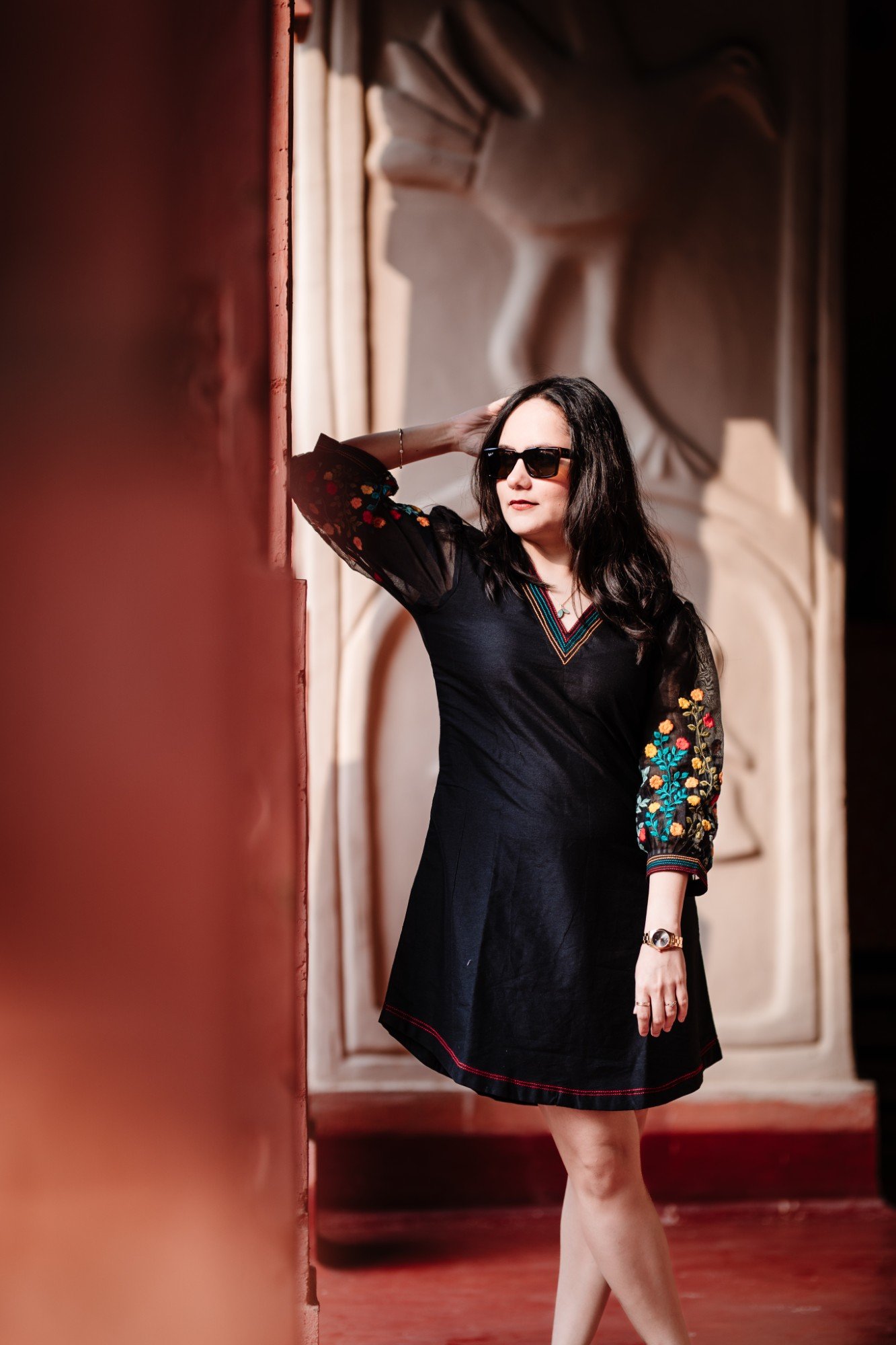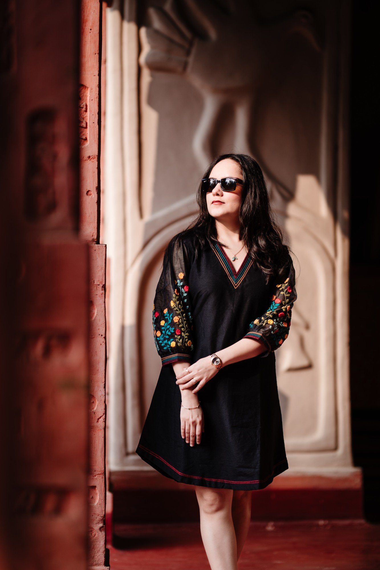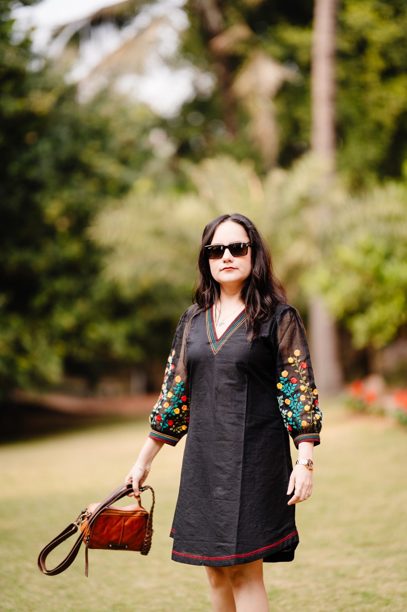Elevate your everyday style with our Noir flora Embroidered Dress, crafted in rich black fabric and adorned with multicoloured floral embroidery on the balloon sleeves. This chic tunic-style dress features a V-neckline with fine anchoring, adding subtle definition and elegance. Designed for effortless comfort and modern flair, it’s perfect for casual outings, brunch dates, or festive gatherings. Pair it with flats or statement accessories for a complete, sophisticated look. Ideal for buyers seeking handcrafted embroidery, artisanal fashion, Indo-western dresses, and comfortable premium wear.