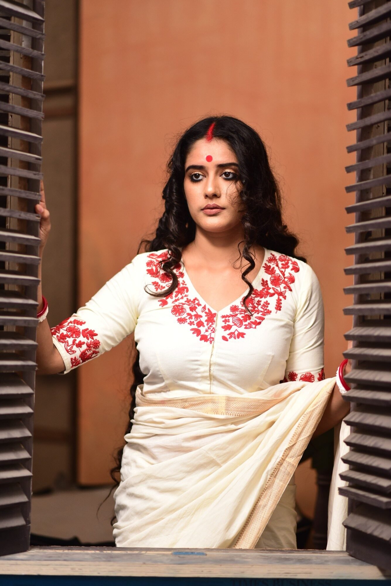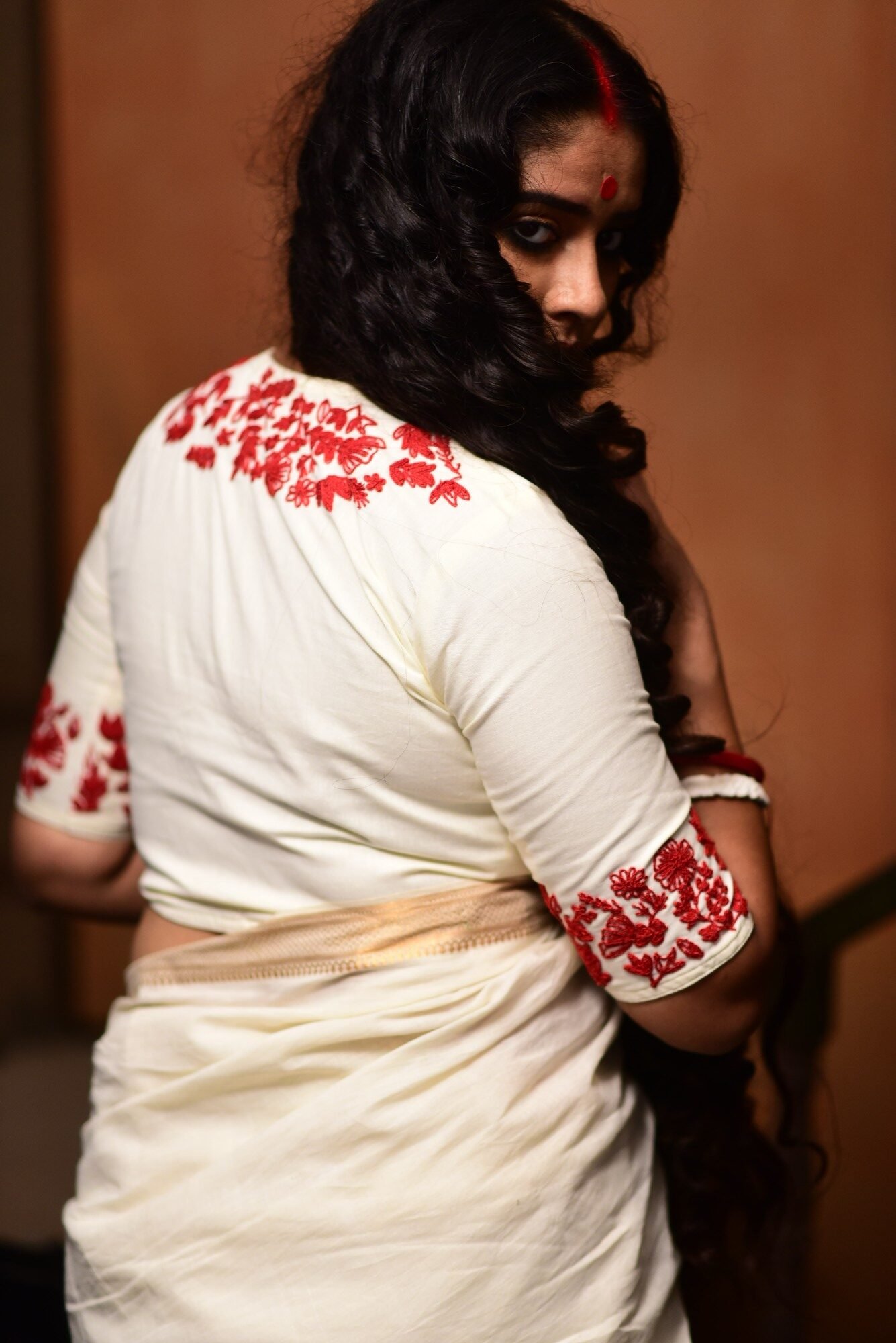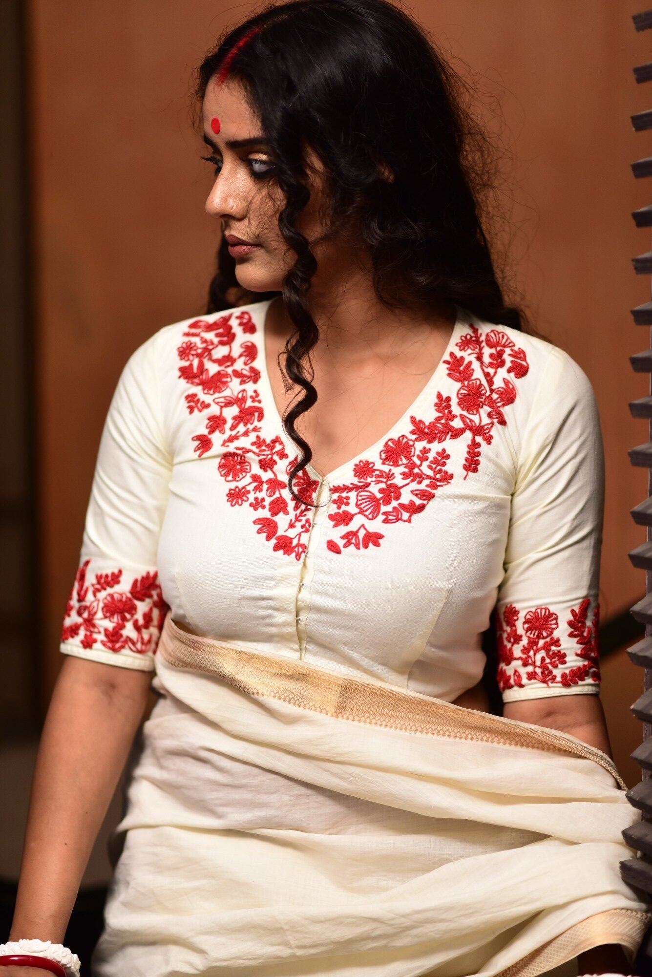The Parna Shabeki blouse is crafted from pristine white khadi linen, celebrating understated elegance and detailed artistry. Designed with a deep V-neck, it features delicate floral embroidery adorning the neckline, echoed gracefully at the back neck and finished at the sleeve hems. The clean white base beautifully highlights the embroidery, making it a versatile and timeless piece. Finished with a front hook enclosure, this blouse is non-padded and perfect for effortless pairing with both traditional and contemporary sarees.