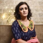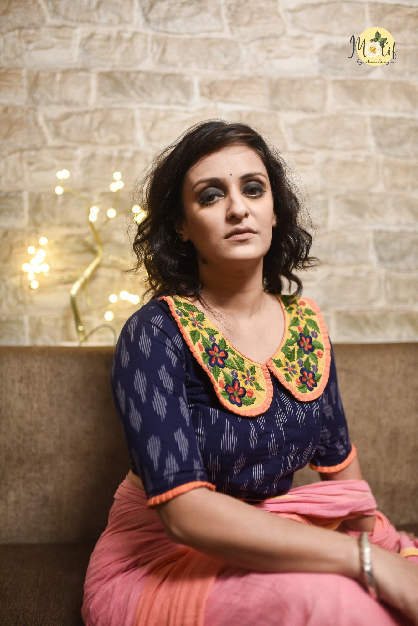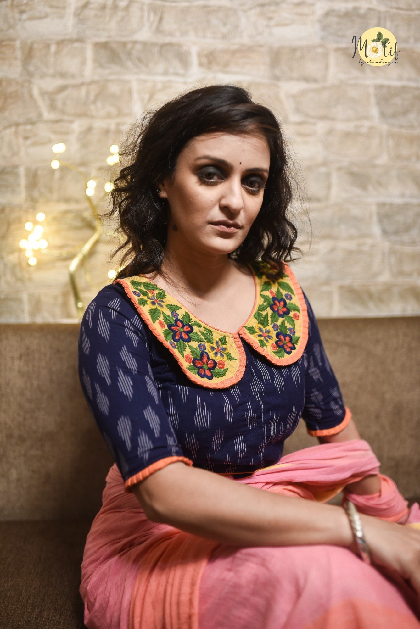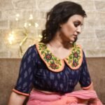 The Peter Pan blouse is crafted in rich navy blue fine-quality Ikkat cotton, featuring a charming Peter Pan collar adorned with delicate floral embroidery. The collar and sleeves are accentuated with elegant rust color frills adding a bright, refined contrast. Designed in a princess-cut silhouette with a front enclosure and non-padded structure, this blouse combines comfort with timeless elegance. Perfect for both traditional and contemporary saree styling.