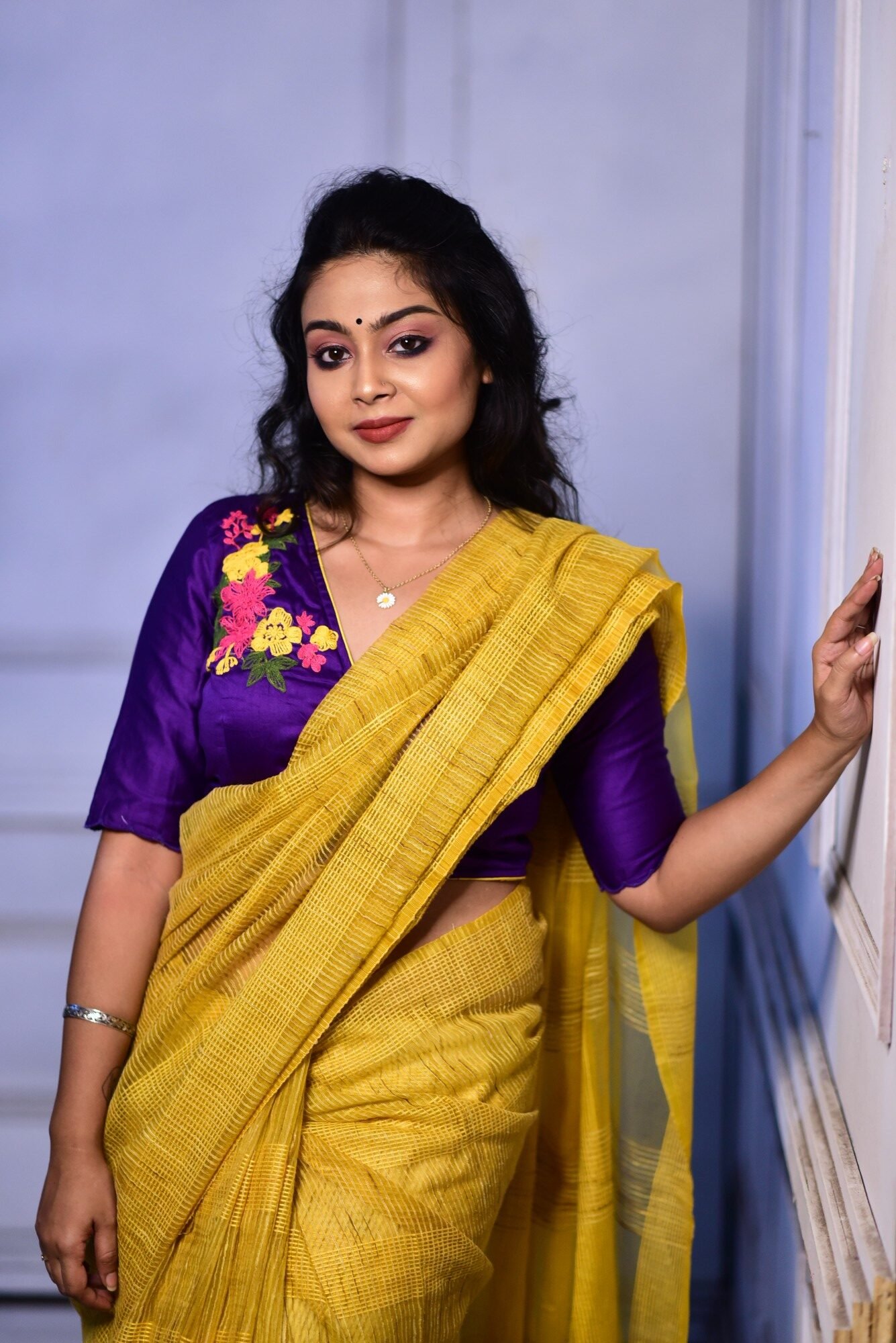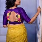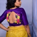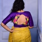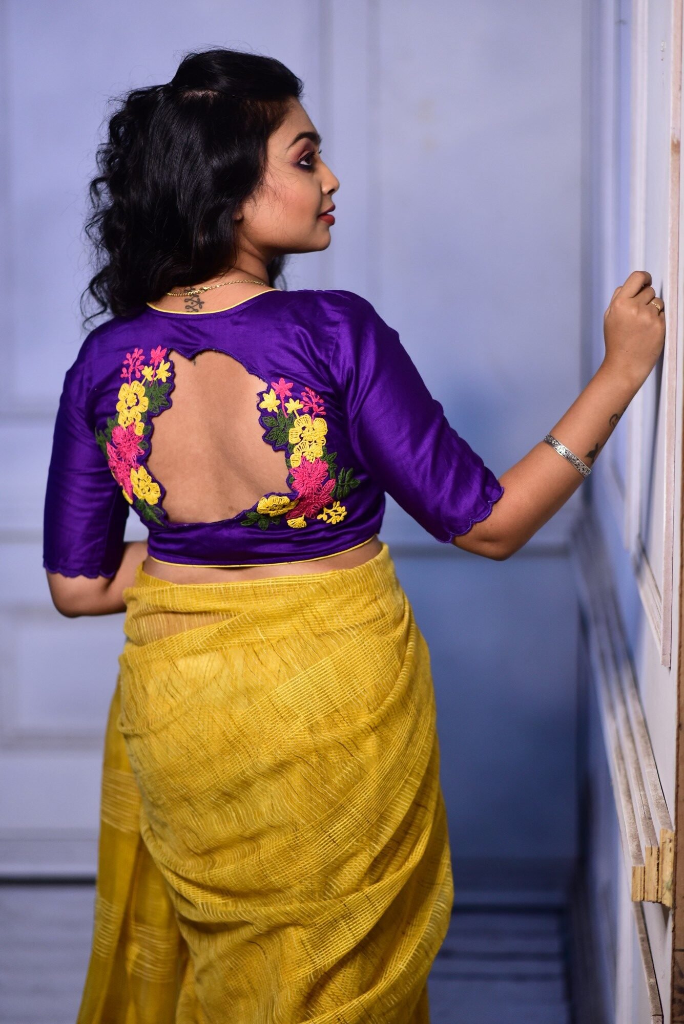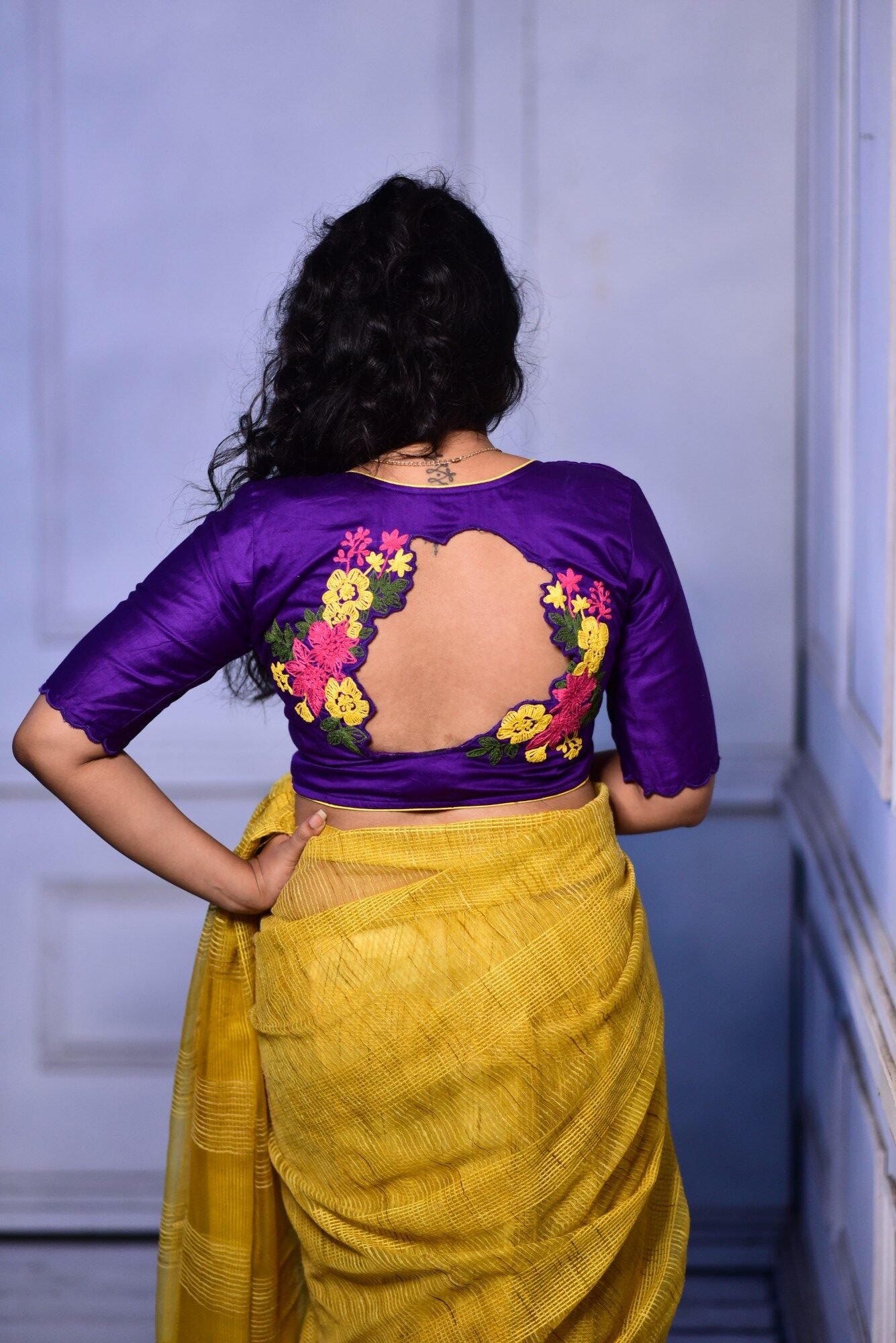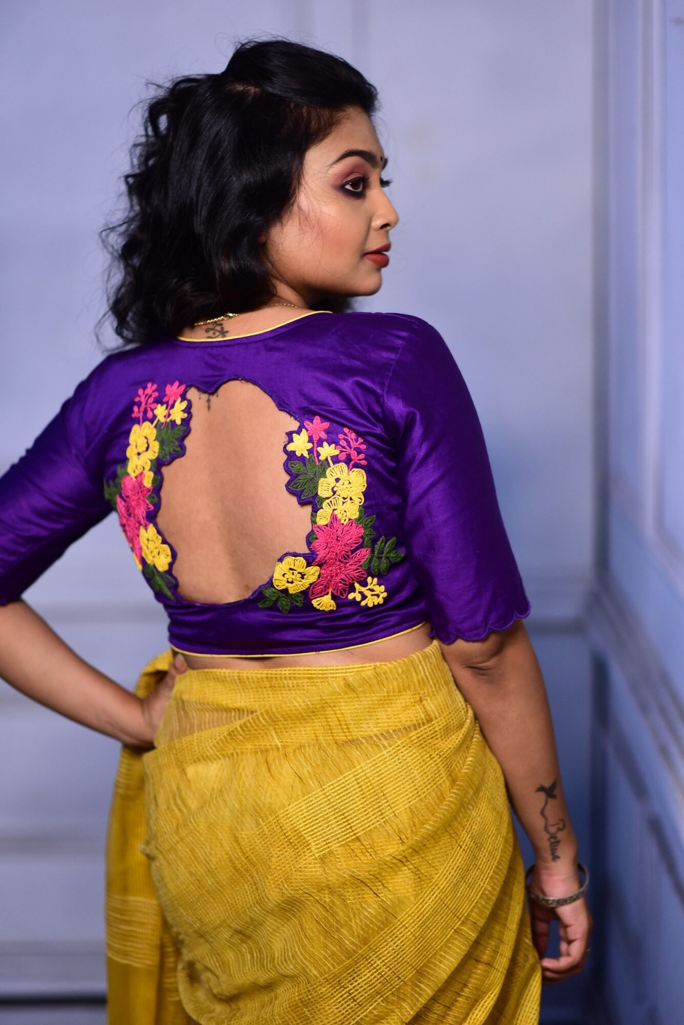 The Purple Magic blouse is crafted in a rich, regal purple Malai cotton fabric that exudes elegance and charm. It features a deep V plunging neckline, beautifully highlighted with multicolour floral vine dori embroidery on the front right neckline. The sleeves are finished with delicate scalloped edges, adding a soft feminine touch.