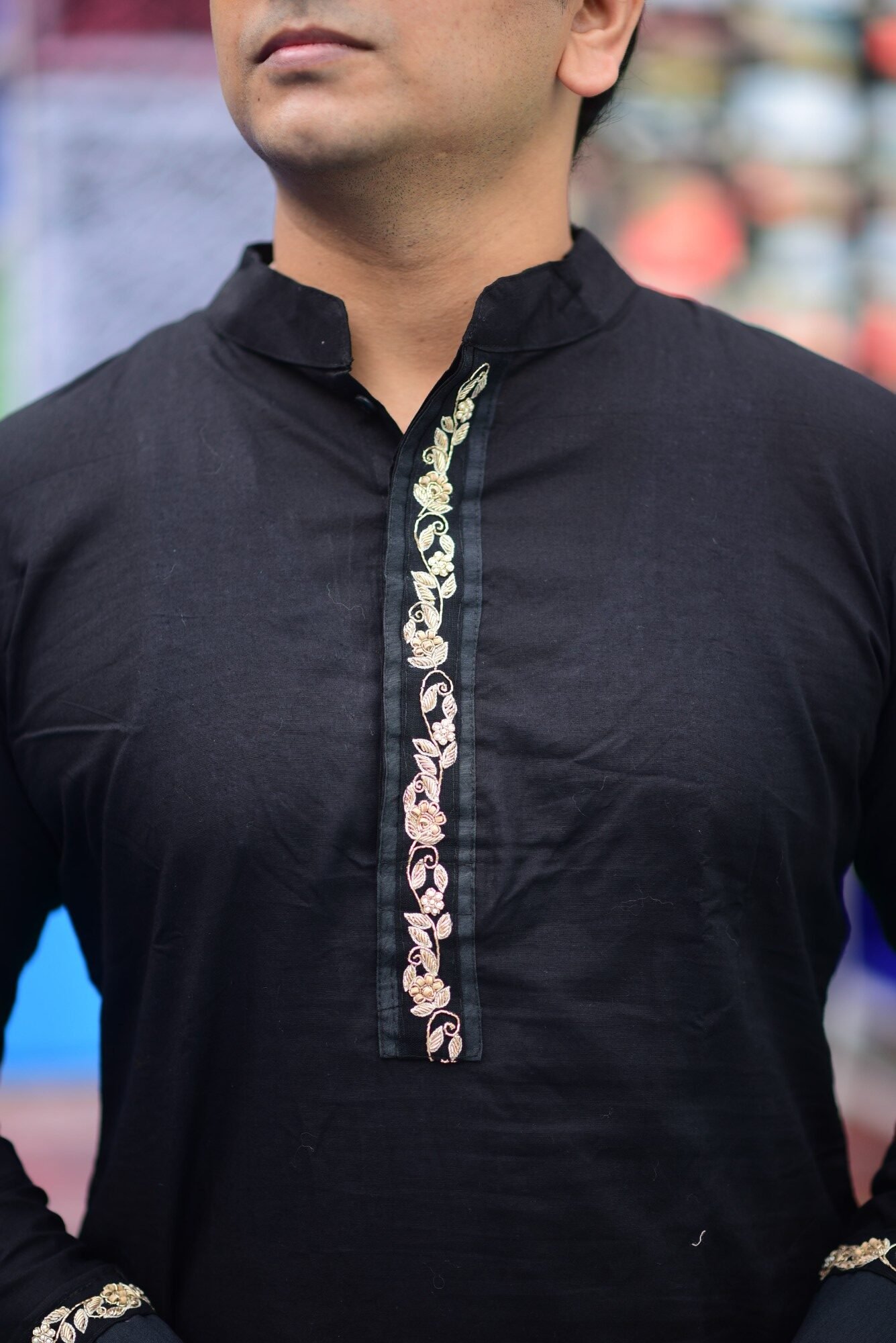 Discover the Regal Punjabi Set, crafted in rich jet black with a matching Punjabi and Payjama. Accented with wooden bead detailing, hand embroidery, and intricate zardausi work on the sleeve edges, front neckline, and back, this ensemble exudes timeless elegance and artisanal craftsmanship. Perfect for festive occasions, cultural celebrations, and statement ethnic wear.
