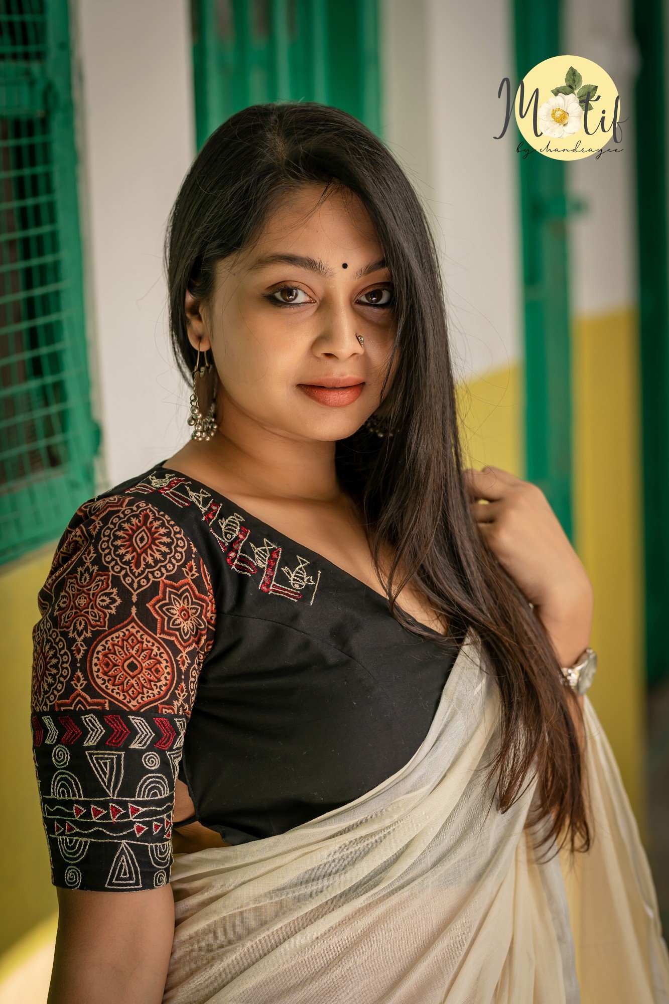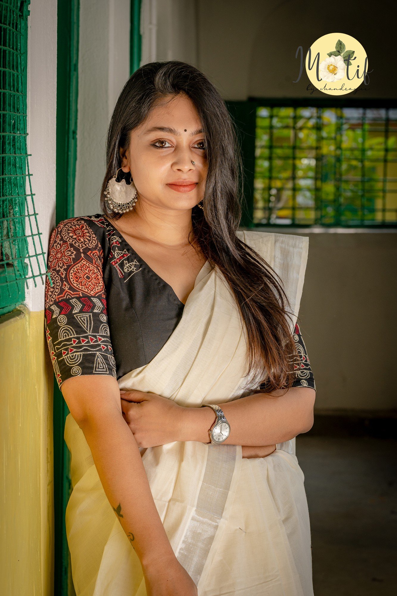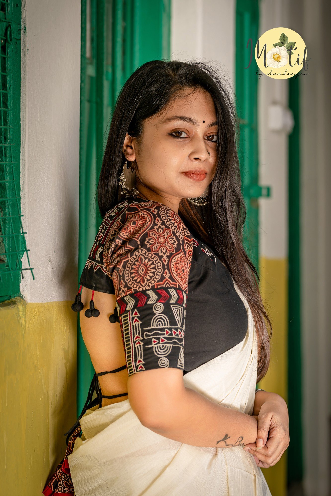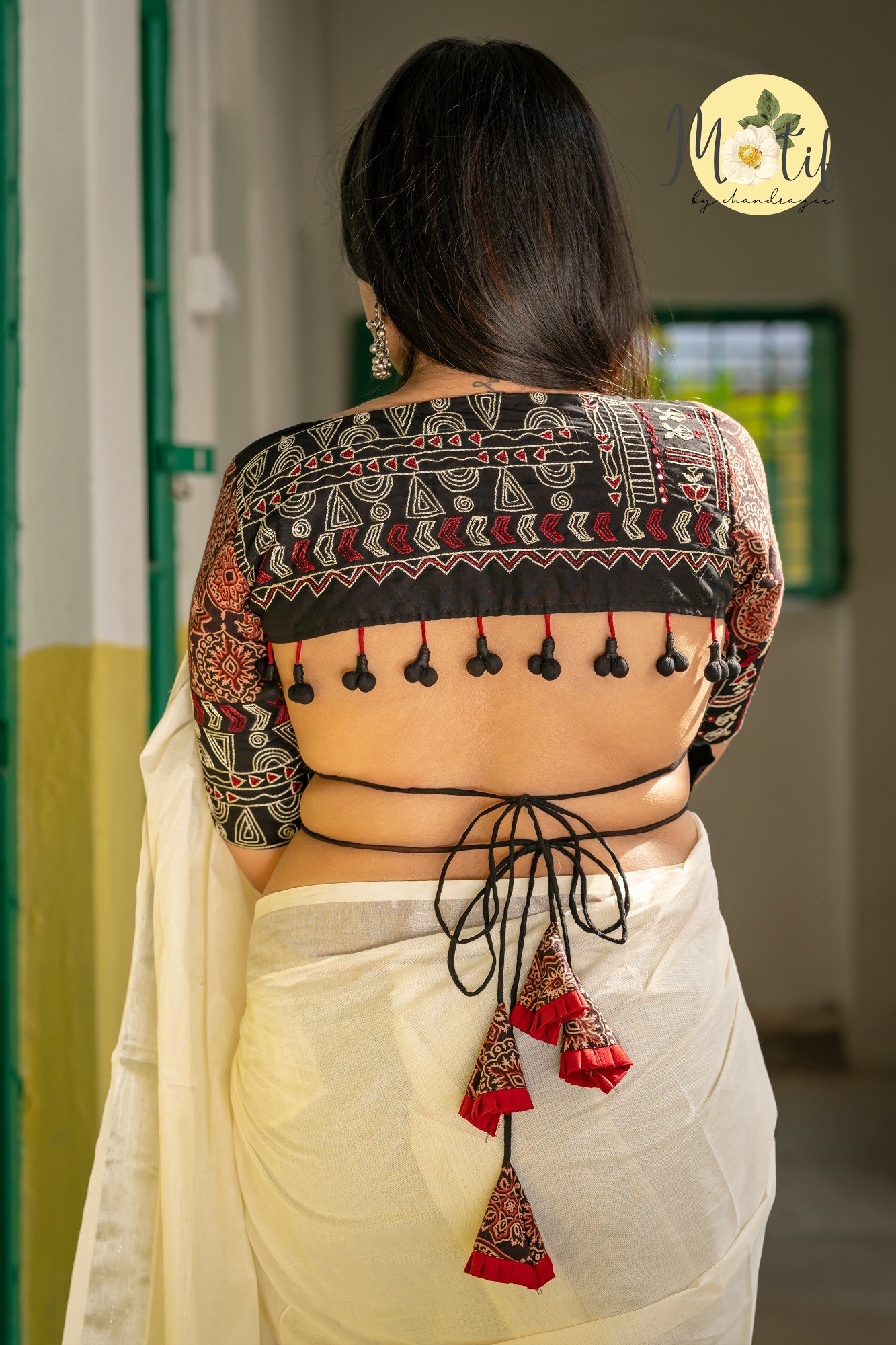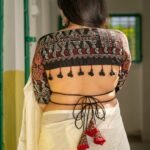 The Sanchari Ajrakh Backless blouse is a striking blend of tradition and bold design. Crafted in a rich black base using cotton silk or khadi linen, it is beautifully paired with pure Ajrakh cotton panels and detailed embroidery. The back features a dramatic backless silhouette with a horizontal embroidered yoke, from which handcrafted tassels gracefully fall, adding movement and artisanal charm. Delicate tie-up dori detailing further enhances the open-back design, making it a true statement piece.