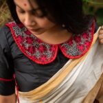 A striking black blouse featuring a statement Peter Pan collar adorned with intricate floral embroidery in rich scarlet tones, highlighted by delicate frills along the collar and sleeves. The finely detailed embroidery adds depth and elegance, making the neckline the true focal point of the blouse. Side tie-up detailing enhances the silhouette, while the front enclosure keeps the look refined and balanced. Designed to pair beautifully with both classic and contemporary sarees, this blouse is non-padded for all-day comfort.