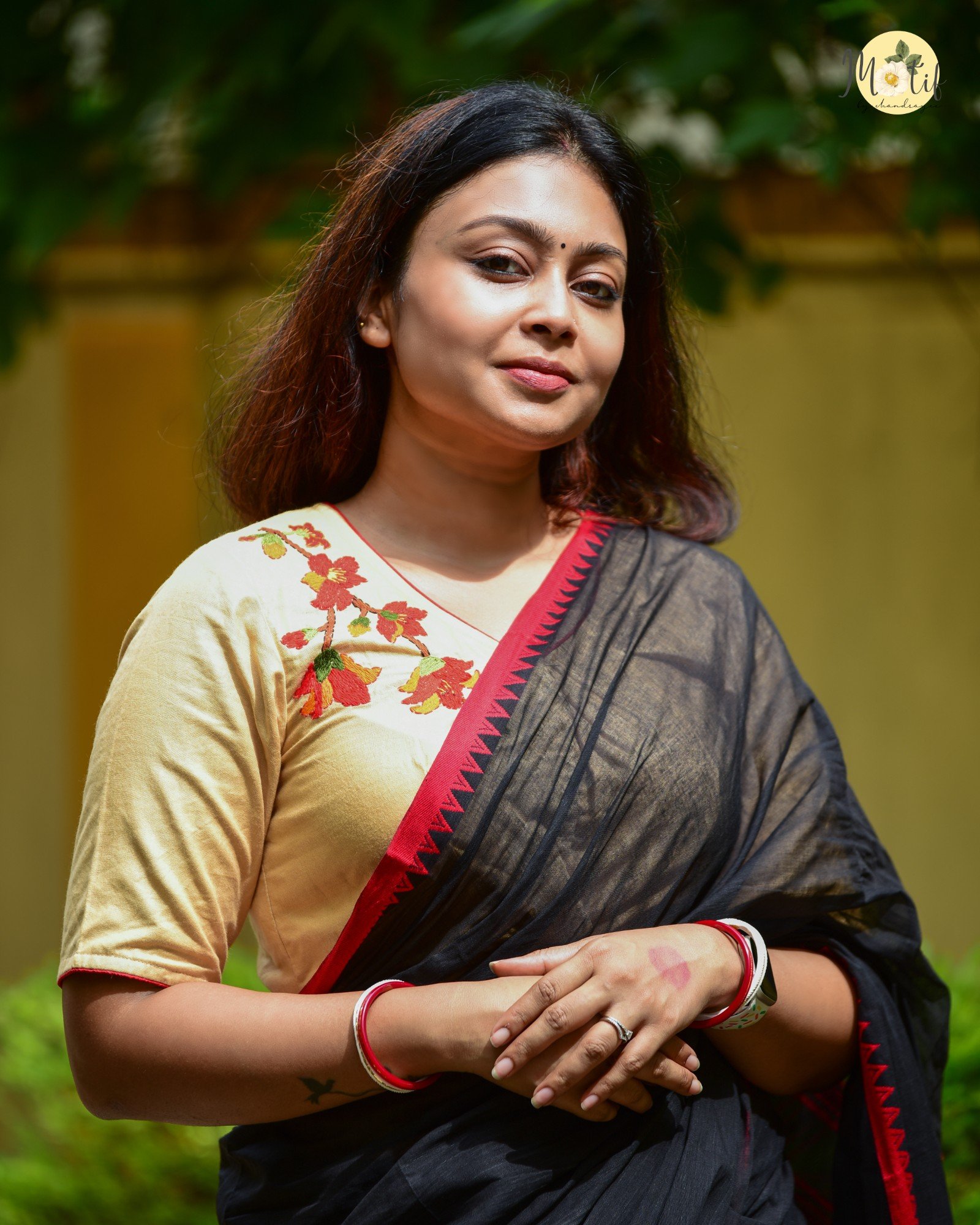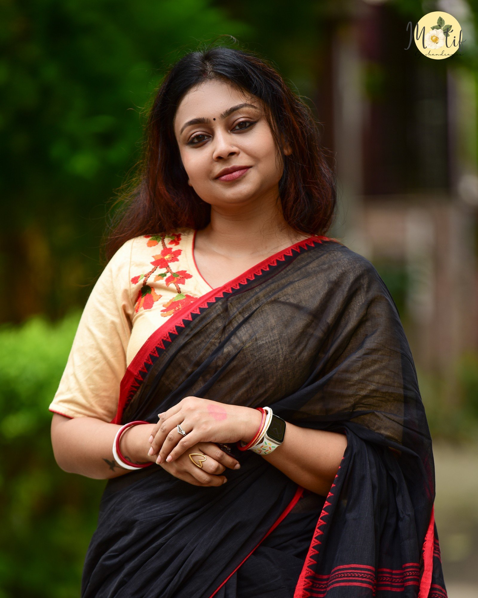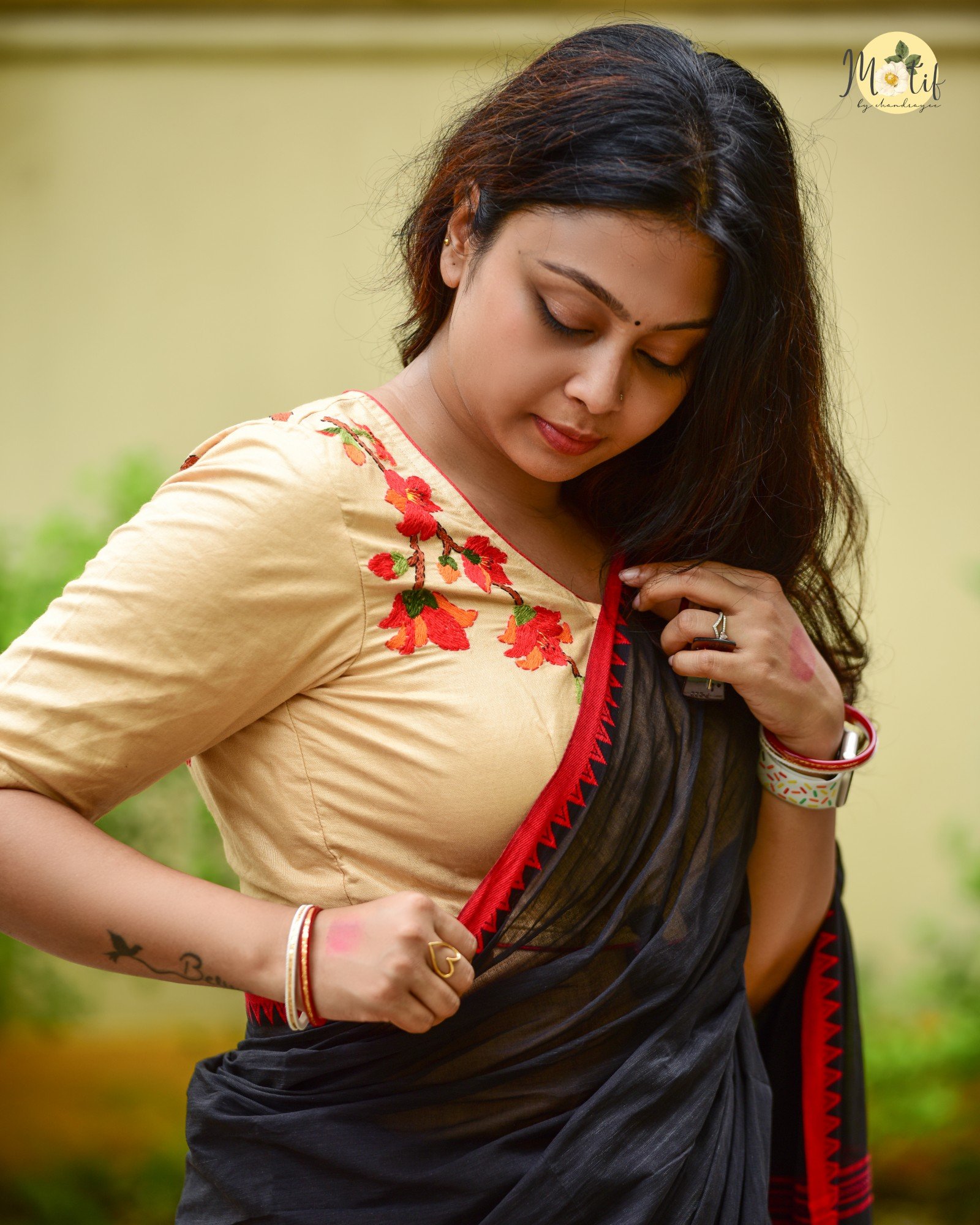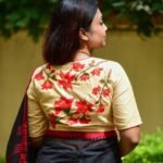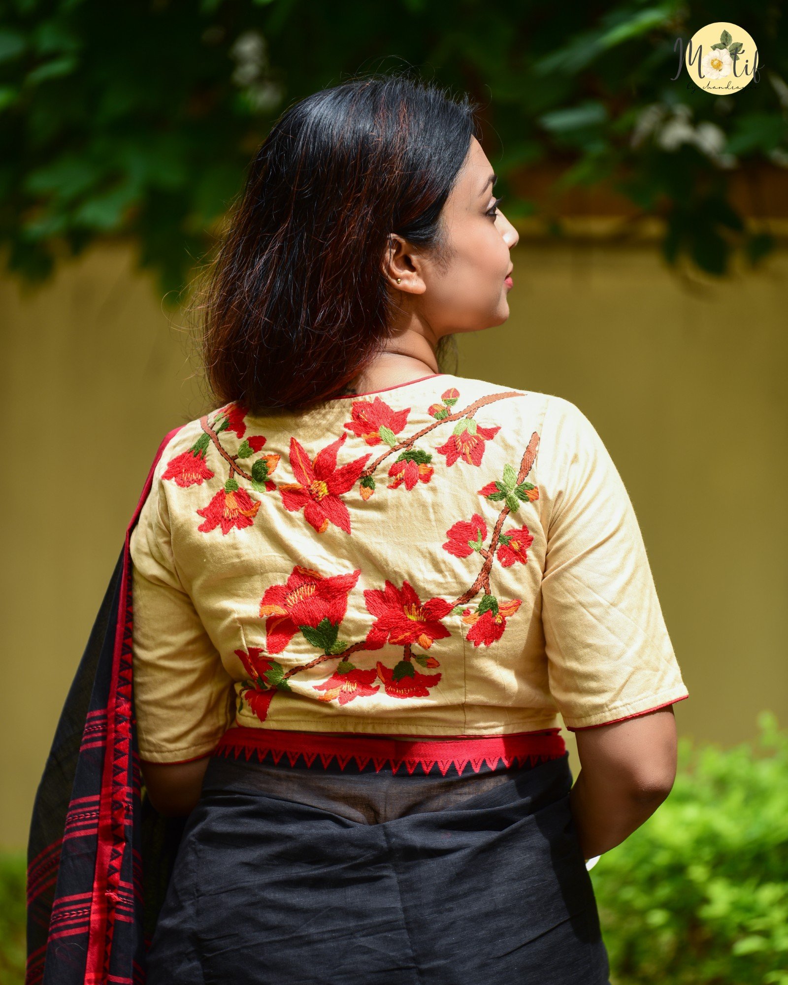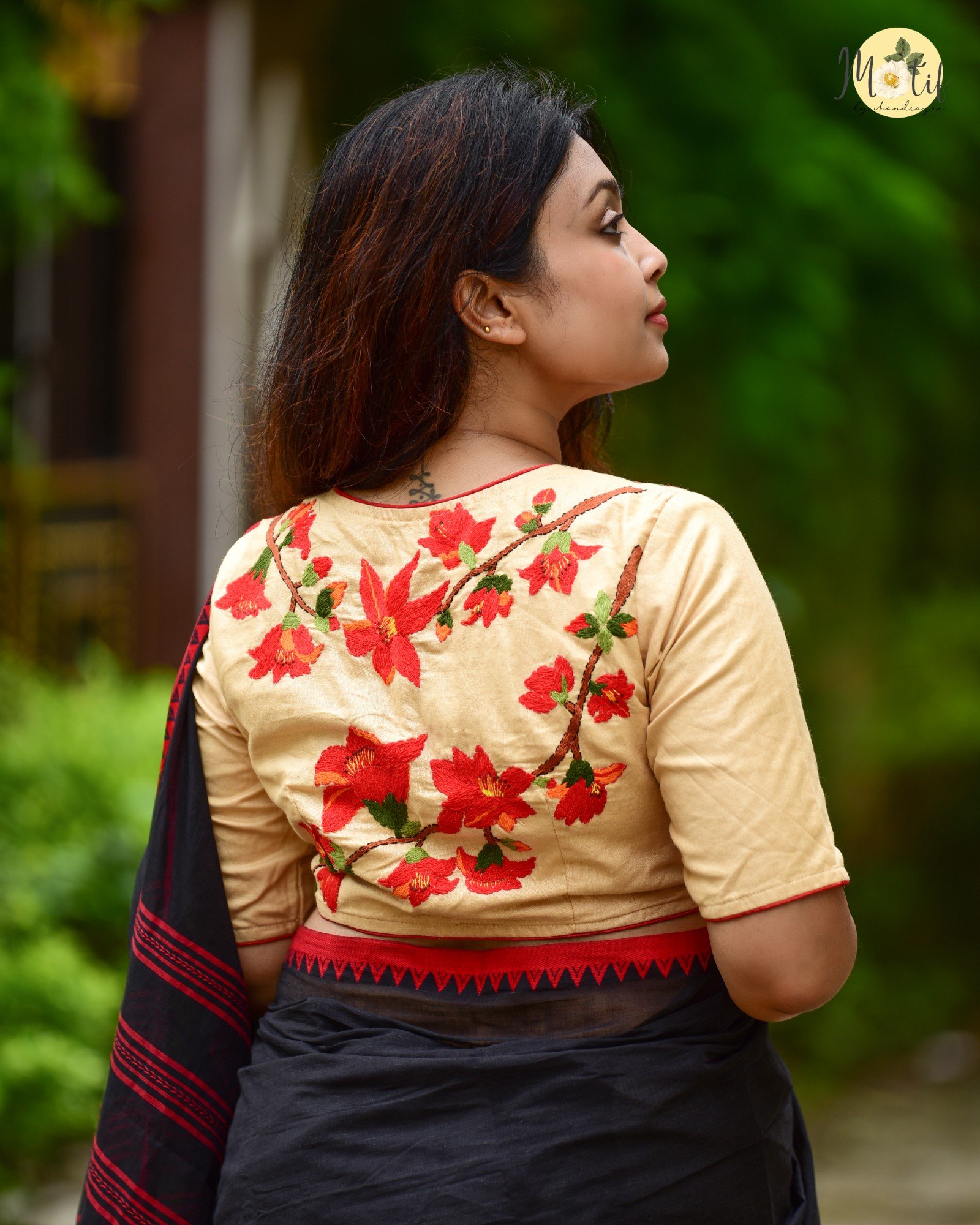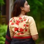 - This blouse is more than just attire – it’s a canvas of artistry. The fiery red Shimul blooms against soft beige exude grace, making you stand out effortlessly. Handcrafted with love, it not only elevates your saree look but also connects you with sustainable, heritage-driven fashion.