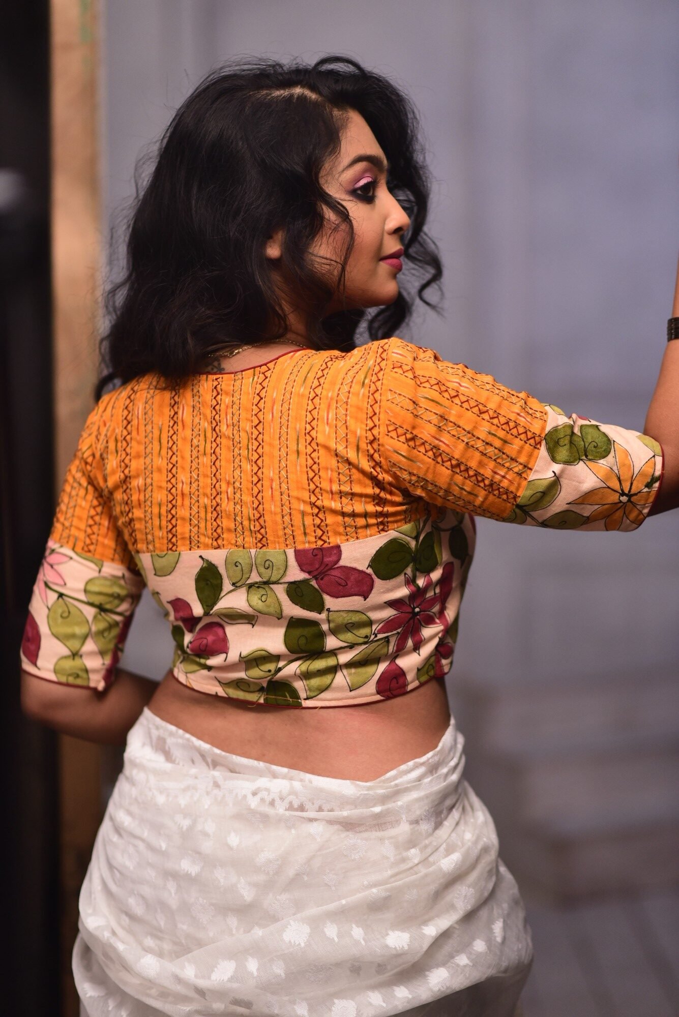 Sunwoven Kalamkari Kantha is a vibrant celebration of craft and colour. Designed on a deep yellow Ikkat base, the blouse is adorned with intricate Kantha embroidery that adds texture and artisanal depth. It is thoughtfully mix-and-matched with hand-done pen Kalamkari on pure Khadi cotton, where pigment colour painting brings delicate motifs to life.