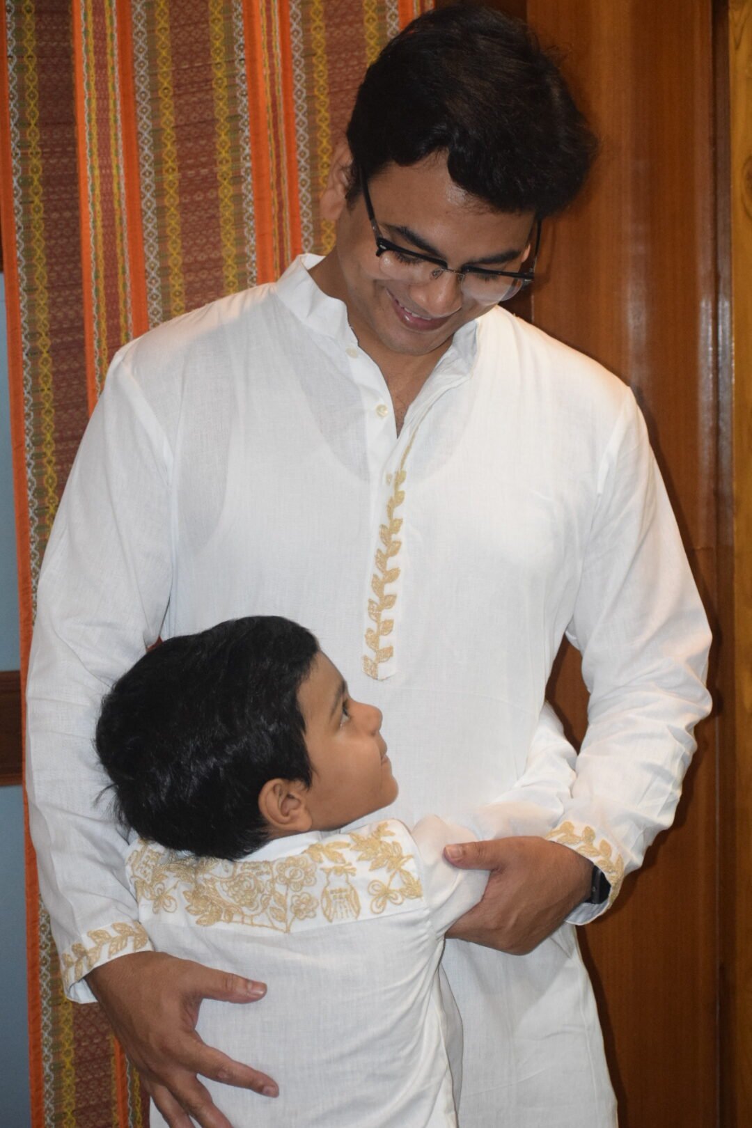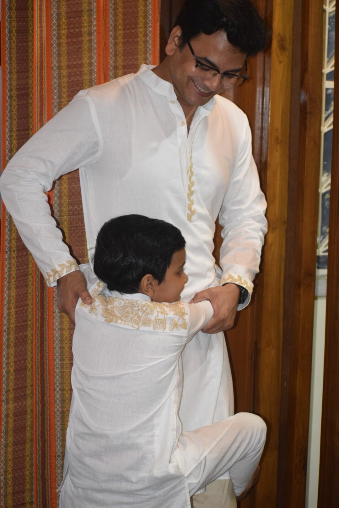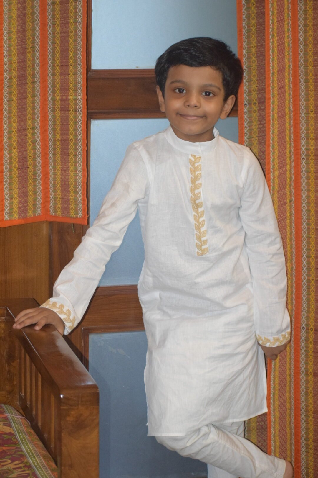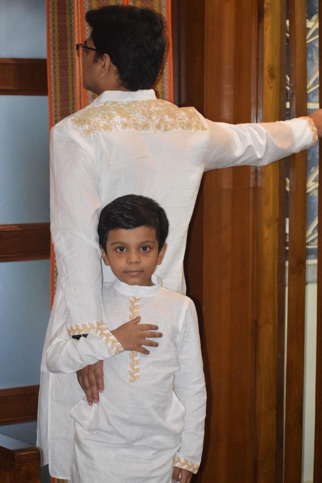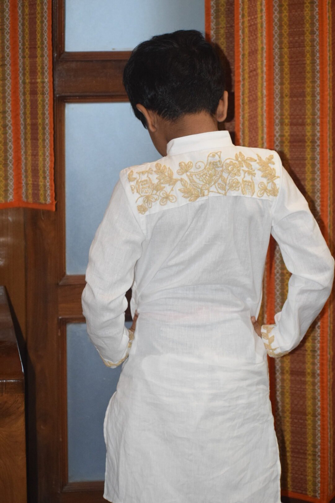 The White Pakhi Punjabi is crafted from premium white khadi linen, featuring elegant beige dori embroidery on the sleeves, front neckline, and back shoulder, beautifully complemented by delicate bird motif embroidery. A timeless ethnic silhouette that blends handcrafted detailing with understated sophistication, perfect for festive and cultural occasions.
