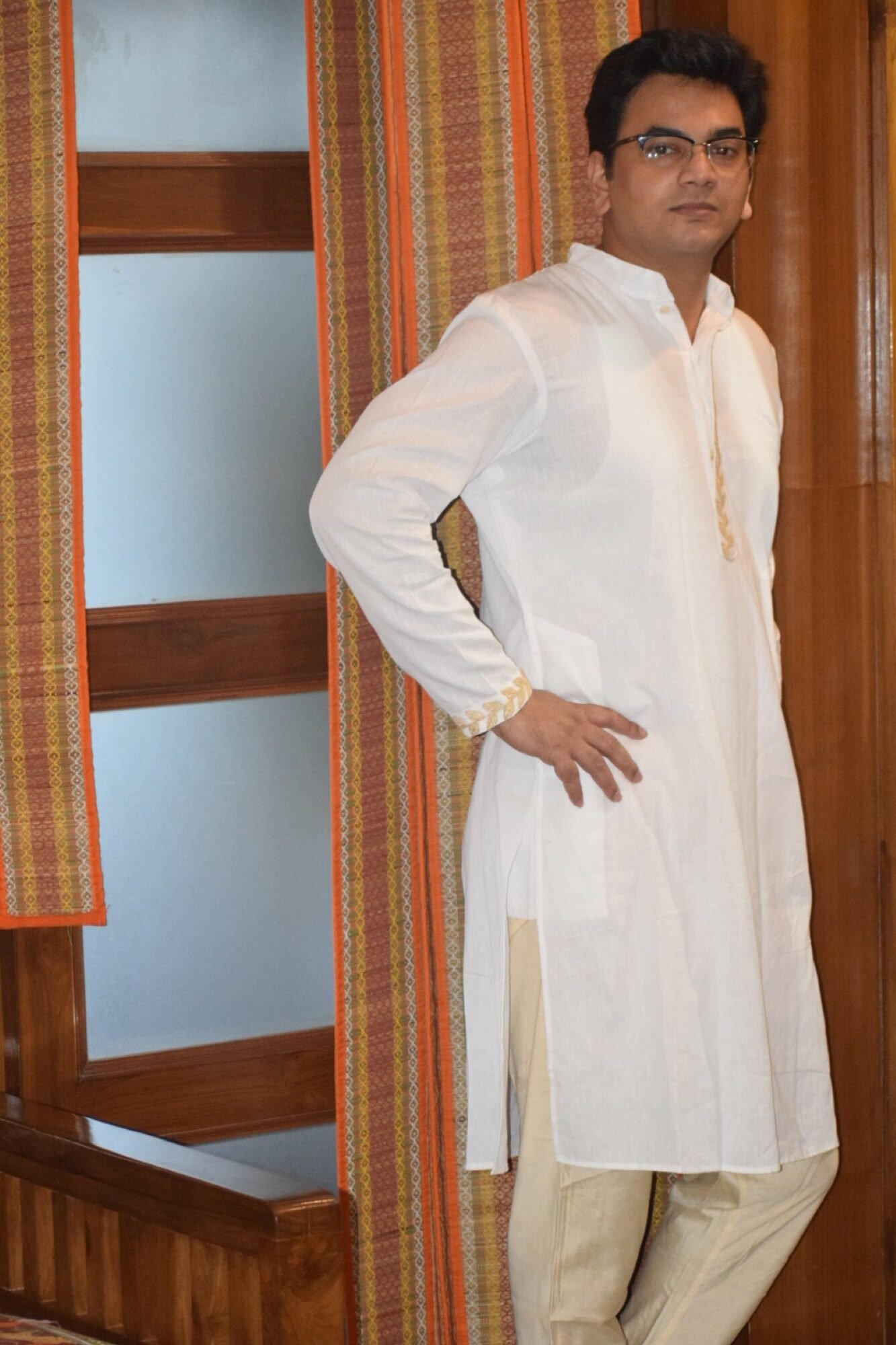 The White Pakhi Punjabi is crafted in premium khadi linen in a soothing milk white shade. Subtle beige dori embroidery highlights the sleeve edges, back shoulder, and front neckline, adding refined handcrafted detail. Designed for comfort and understated elegance, this Punjabi is ideal for festive occasions and graceful everyday wear.