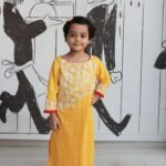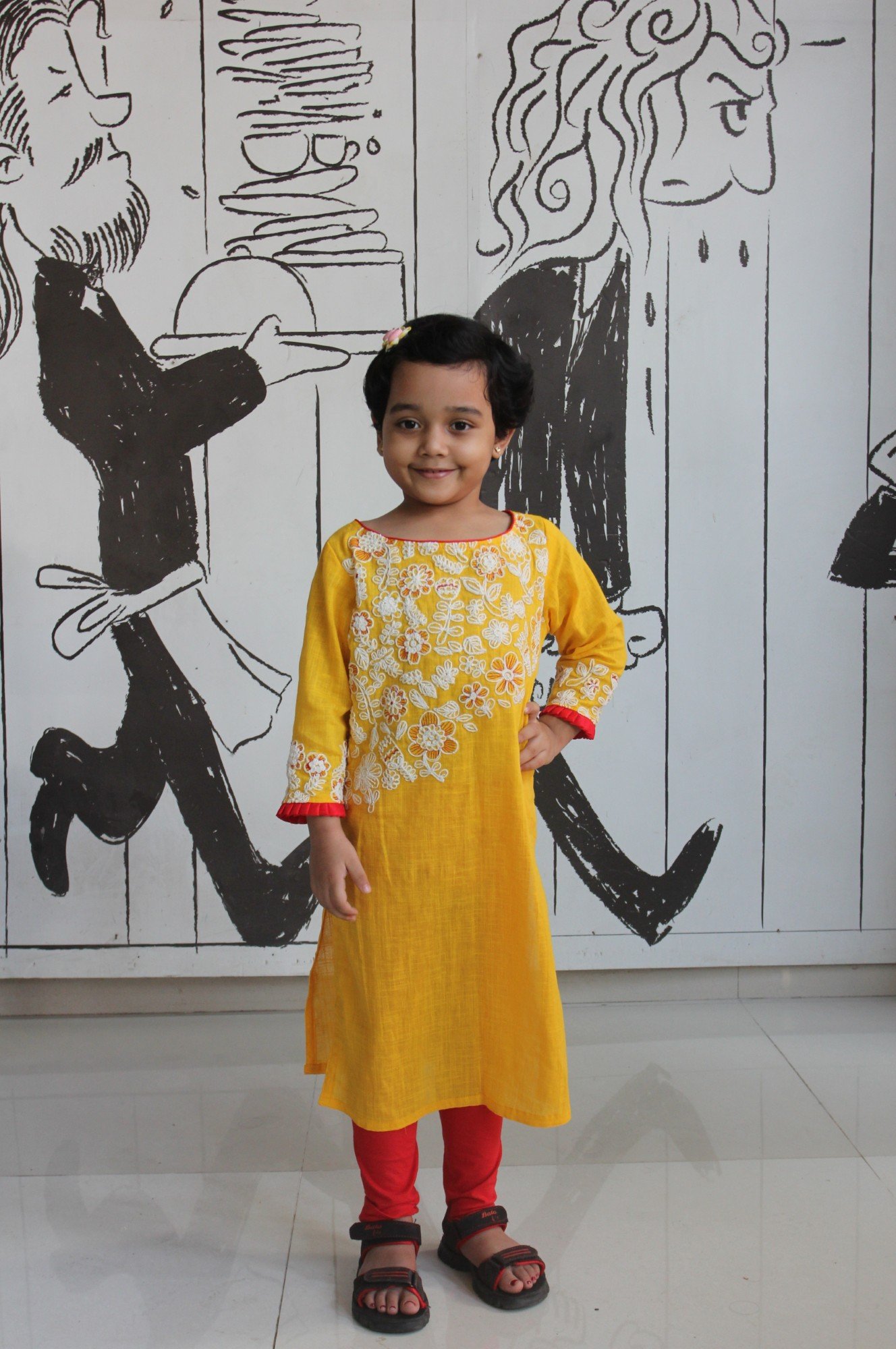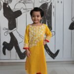 The Yellow Dori Kurti features a vibrant sunshine yellow base adorned with delicate floral and leaf motif embroidery on the upper portion and sleeves . Designed with an elegant boat neckline highlighted by contrast red cord piping and finished with red frill detailing on the sleeves, this kurti blends handcrafted charm with a bright, festive appeal—perfect for daytime celebrations and ethnic wear.